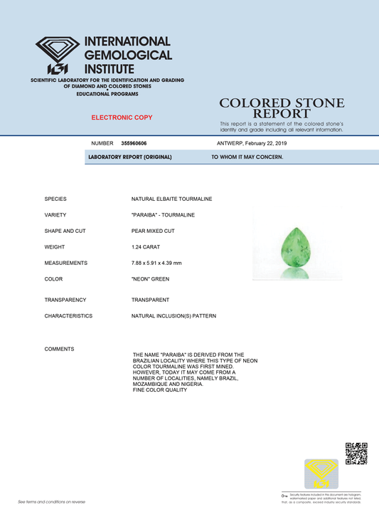 IGI 1.24 ct. Neon Green Paraiba Tourmaline & Diamond Ring in 14K White Gold