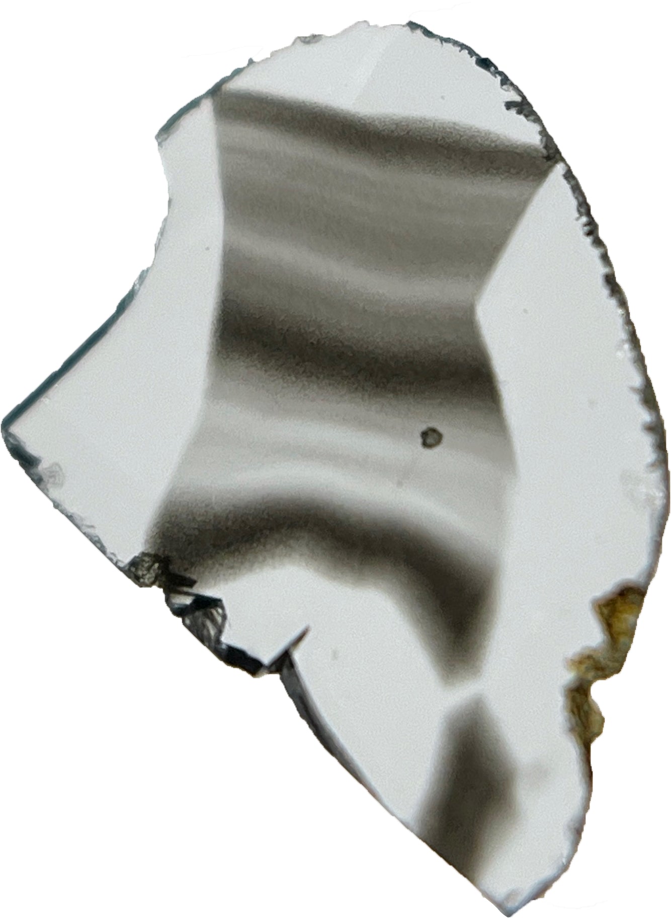 This extremely rare and unusual, natural fancy gray asteriated diamond weighs 0.11 carat. It measures 6.85 x 5.13 x 0.39mm and contains a gorgeous hydrogen cloud inclusion radiating out from its center.