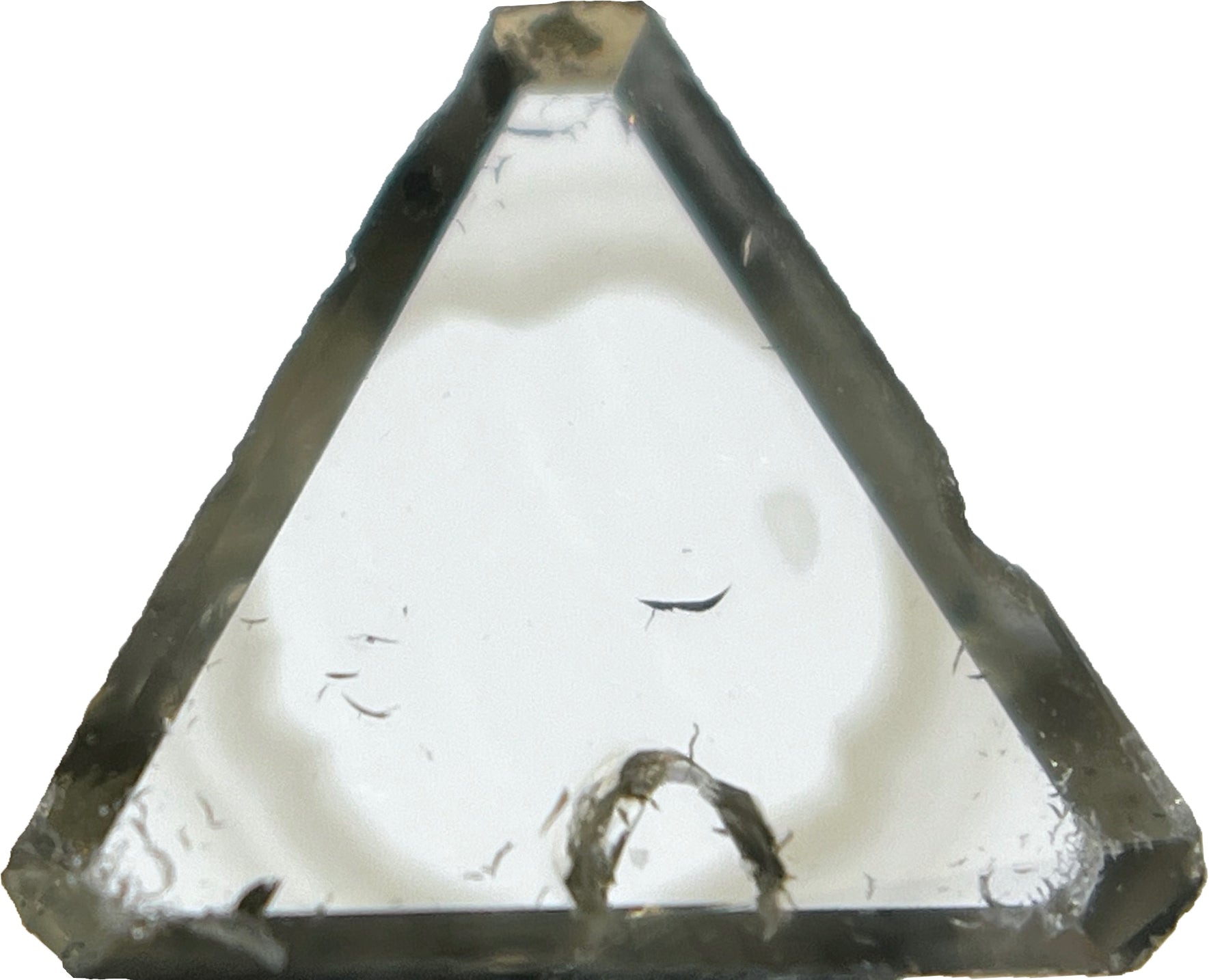 This extremely rare and unusual, natural fancy gray asteriated diamond weighs 0.14 carat. It measures 5.89 x 5.62 x 0.51mm and contains a gorgeous hydrogen cloud inclusion radiating out from its center. It also is home to a cute little trigon inclusion.