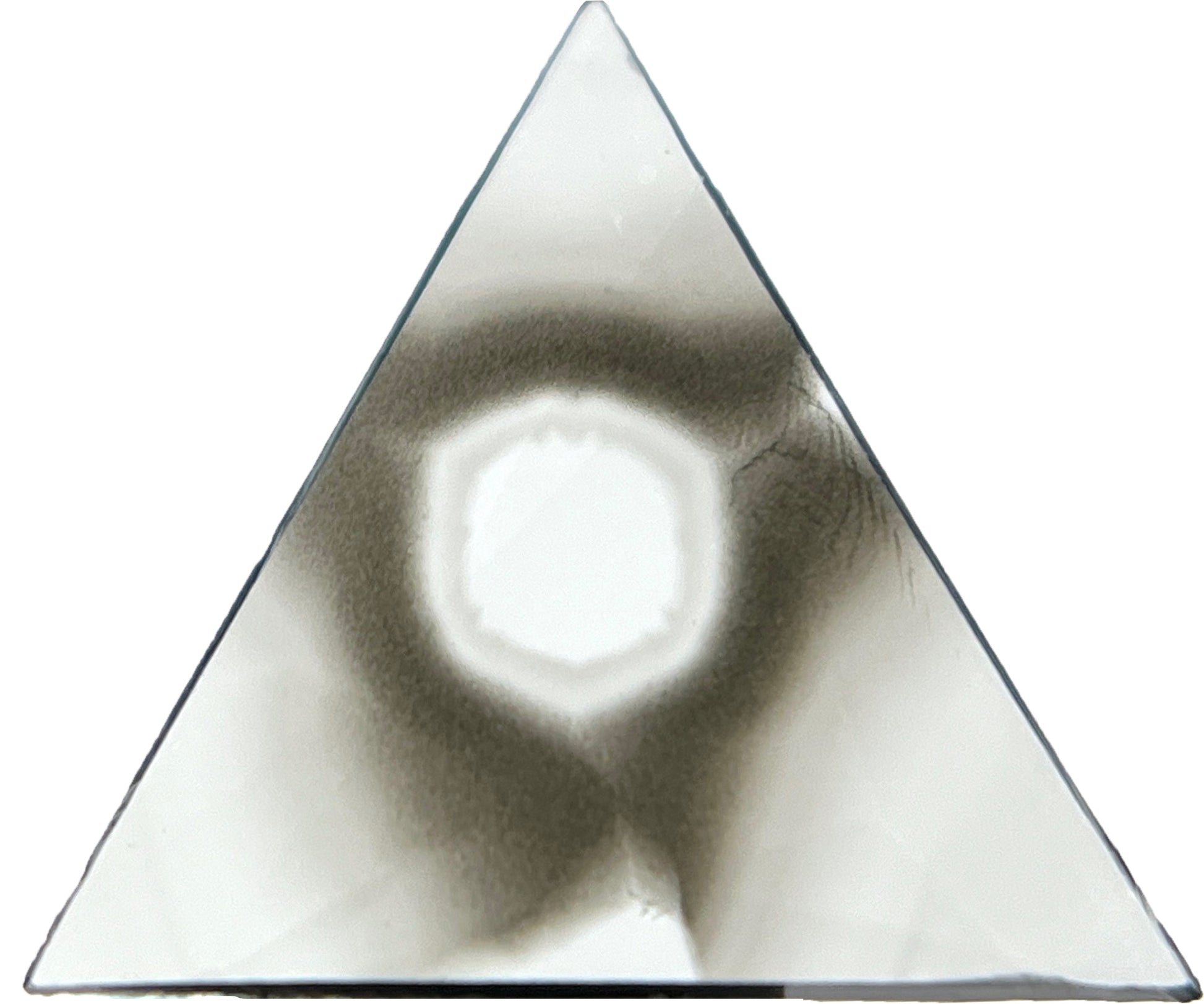 This extremely rare and unusual, triangular-shaped, natural fancy gray asteriated diamond weighs 0.14 carat. It measures 6.70 x 6.55 x 0.41mm and contains a gorgeous hydrogen cloud inclusion radiating out from its center.