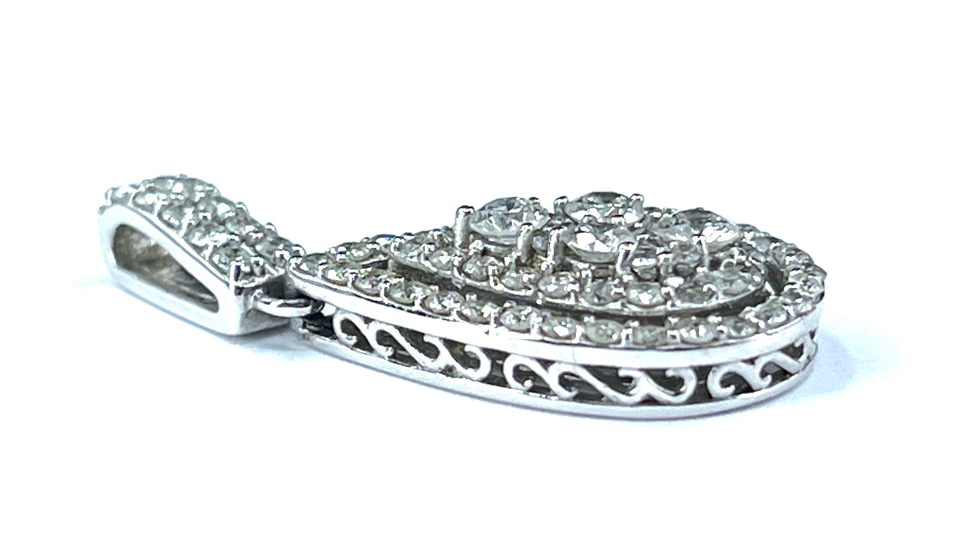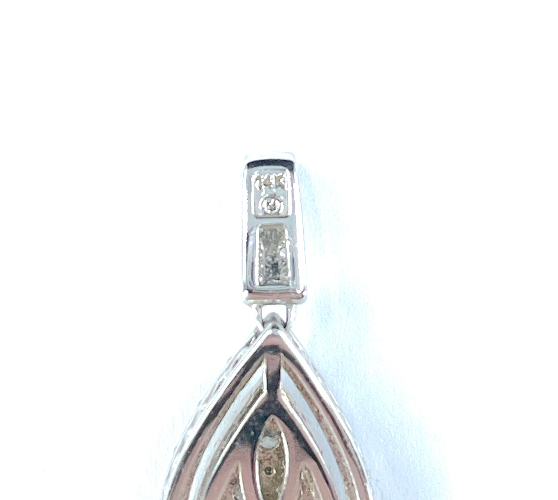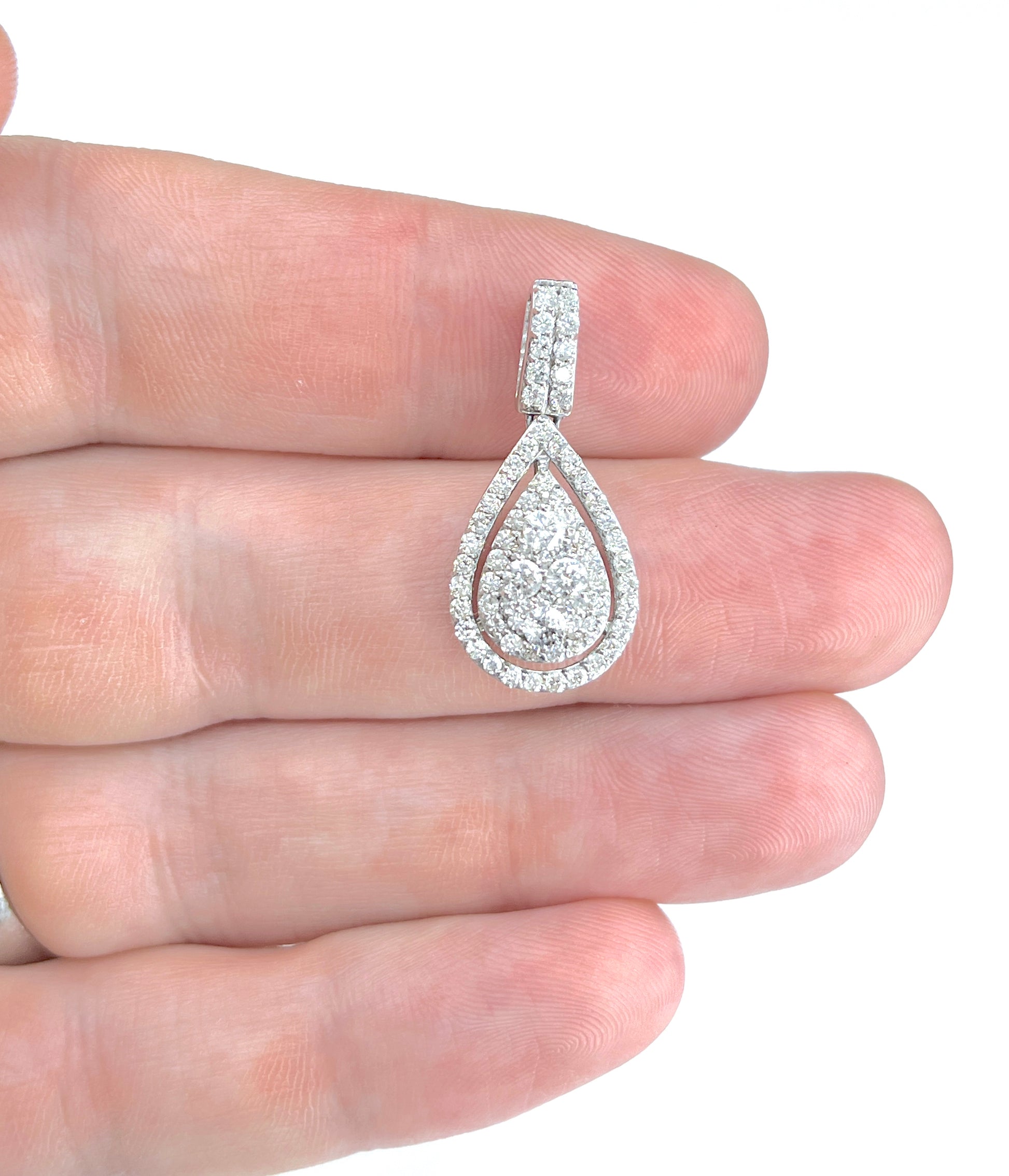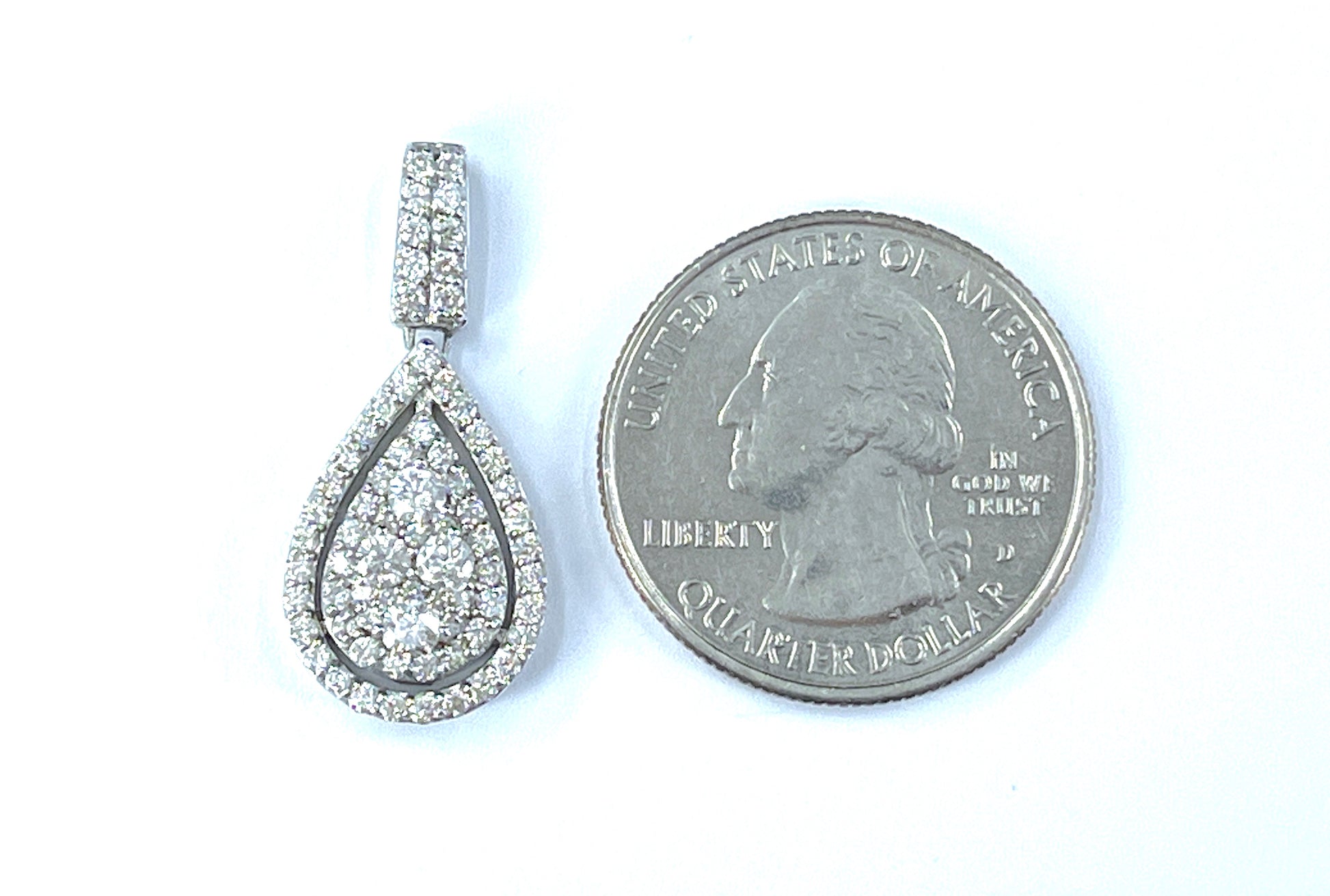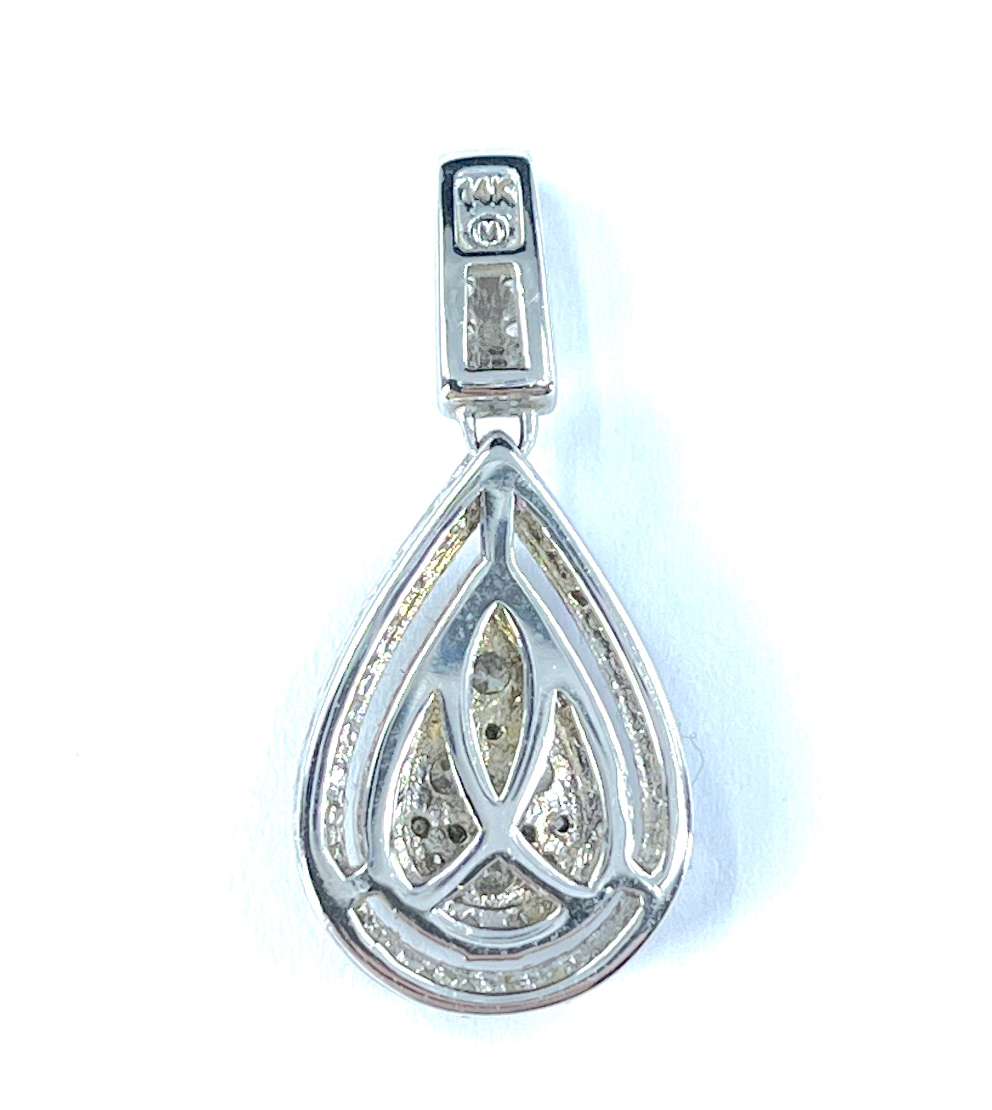 This beautiful droplet pendant features approximately 1.20 carats of diamonds mounted in 14 karat white gold. The pendant measures 28 x 13 millimeters overall, which includes the hinged bail. The piece is hallmarked, "14K".