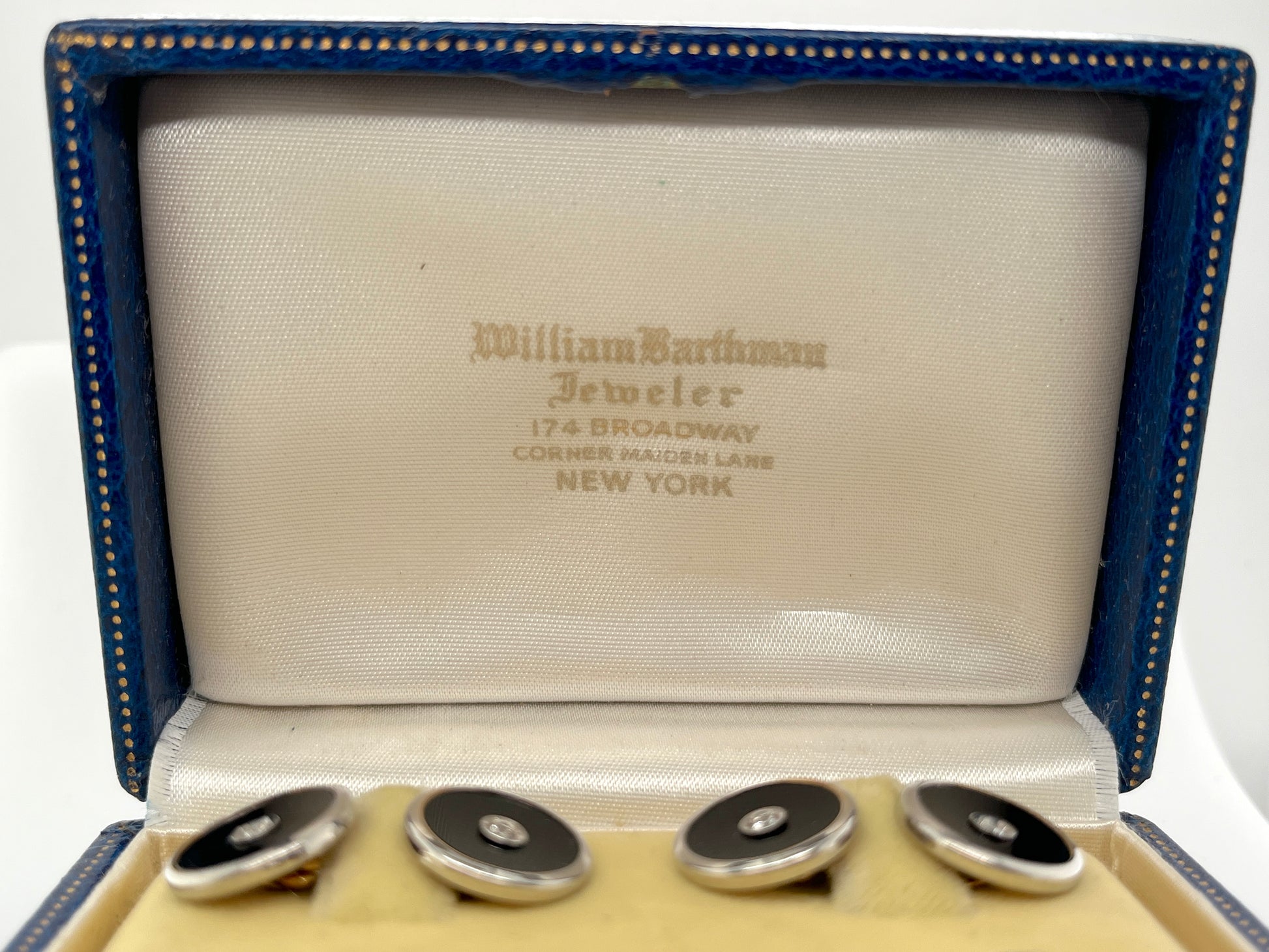 The set is accompanied by its original fitted presentation box from William Barthman Jeweler, 174 Broadway, corner of Maiden Lane, New York—a notable period retailer—adding to its historical and collectible appeal.