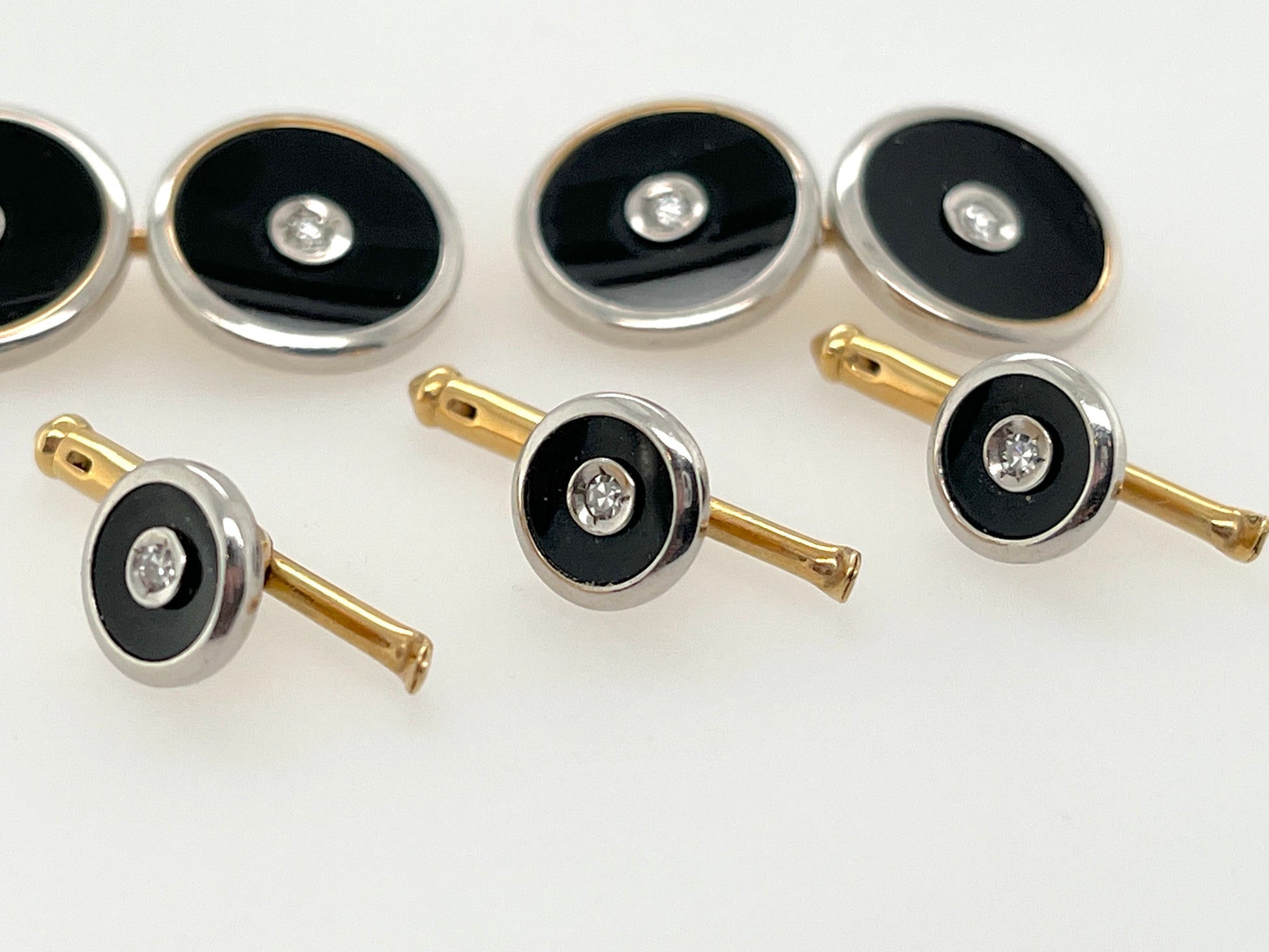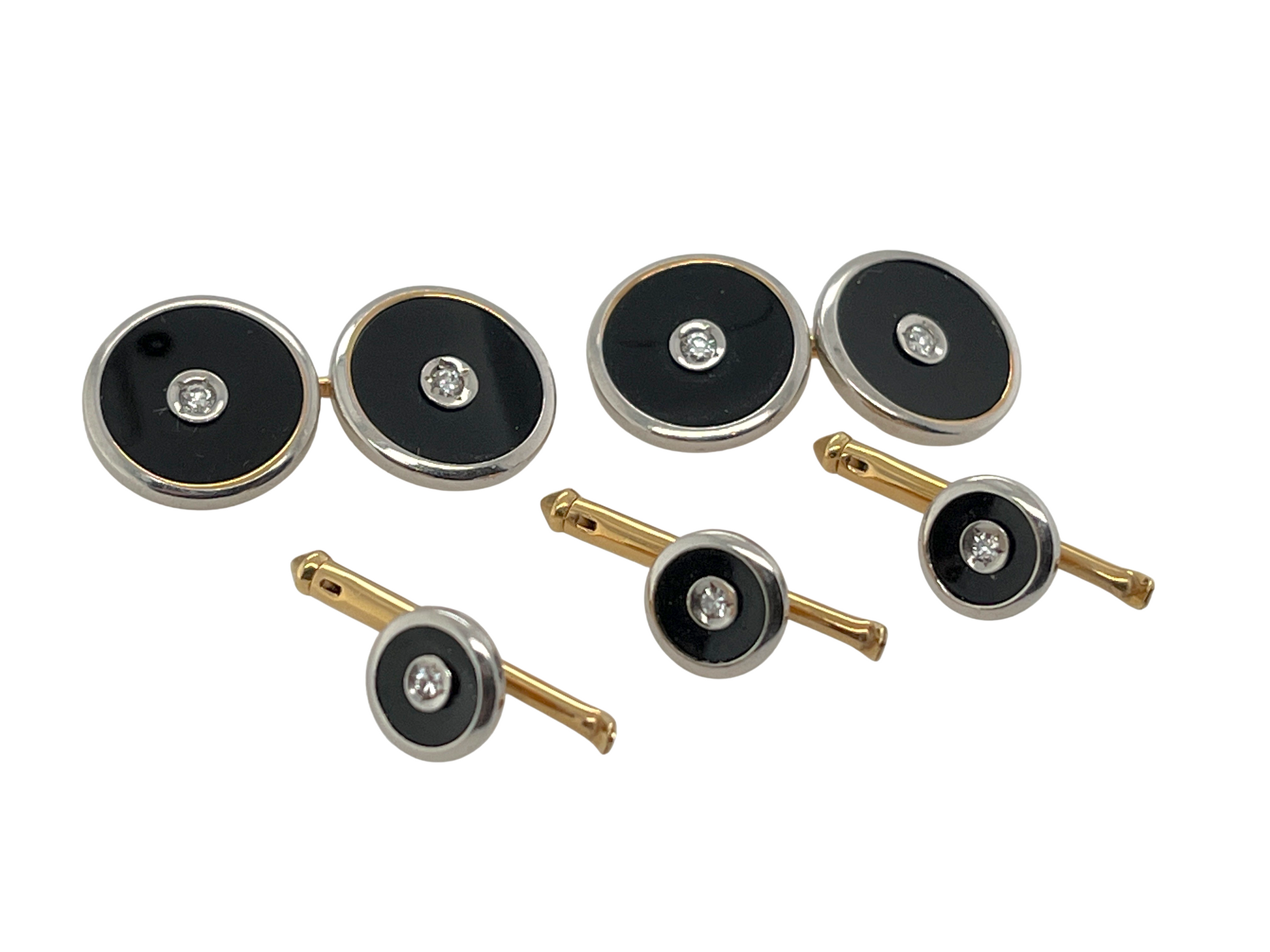 Crafted by Larter & Sons in 14K gold and platinum, this elegant five-piece cufflinks and shirt stud dress set features natural diamonds set against circular black onyx discs. The striking contrast of white diamonds against black onyx, combined with a clean geometric motif, exemplifies the refined aesthetic of the Art Deco era.