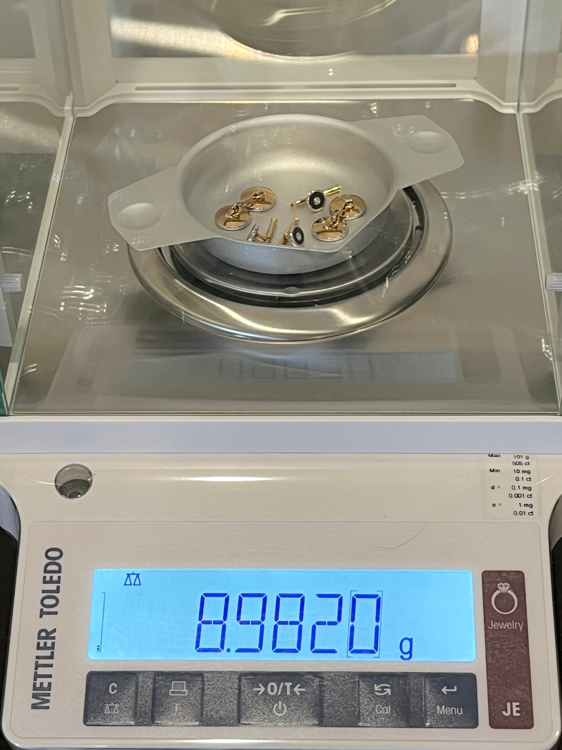 Each piece bears Larter & Sons’ registered maker’s mark and is hallmarked “14K.” XRF analysis confirms construction in 14K gold and platinum.