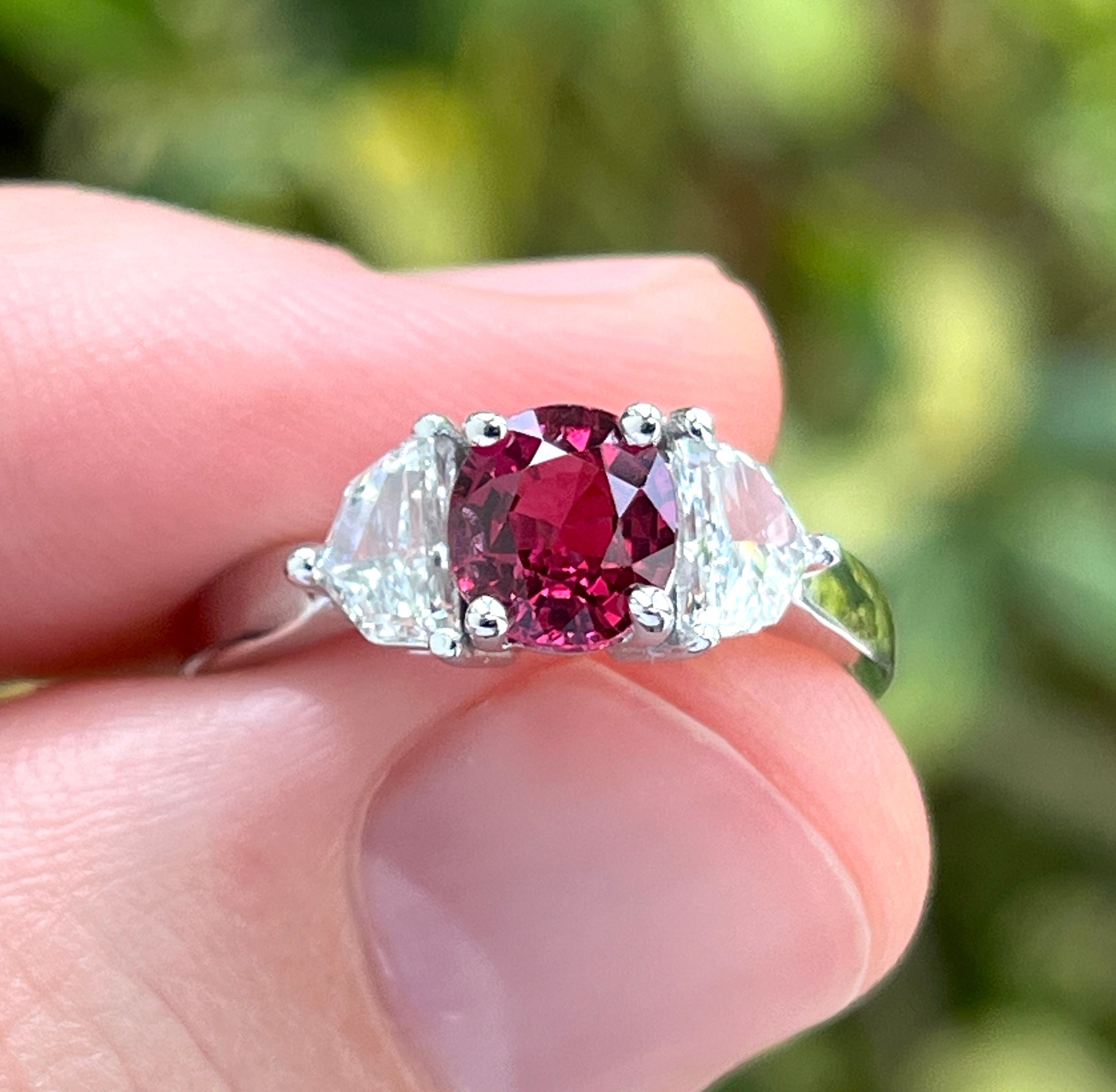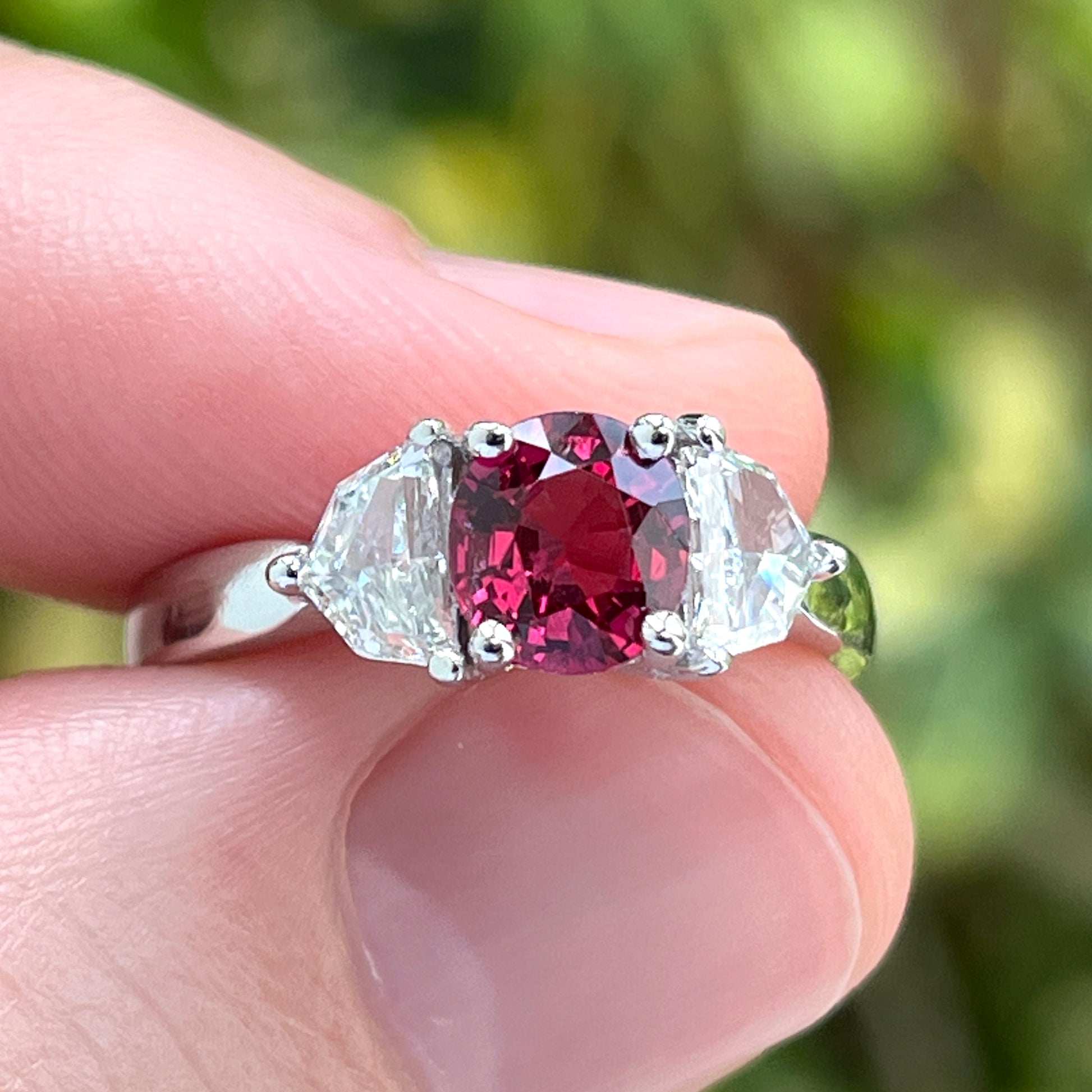 The natural spinel is flanked by a perfectly-matched pair of Cadillac shaped natural diamonds. The diamonds have a total carat weight of 0.62 carat.