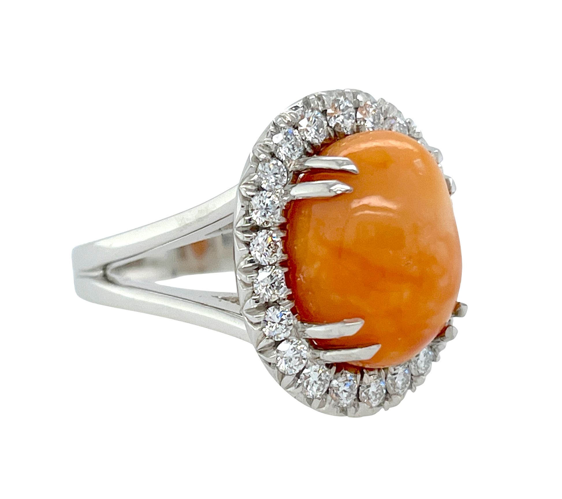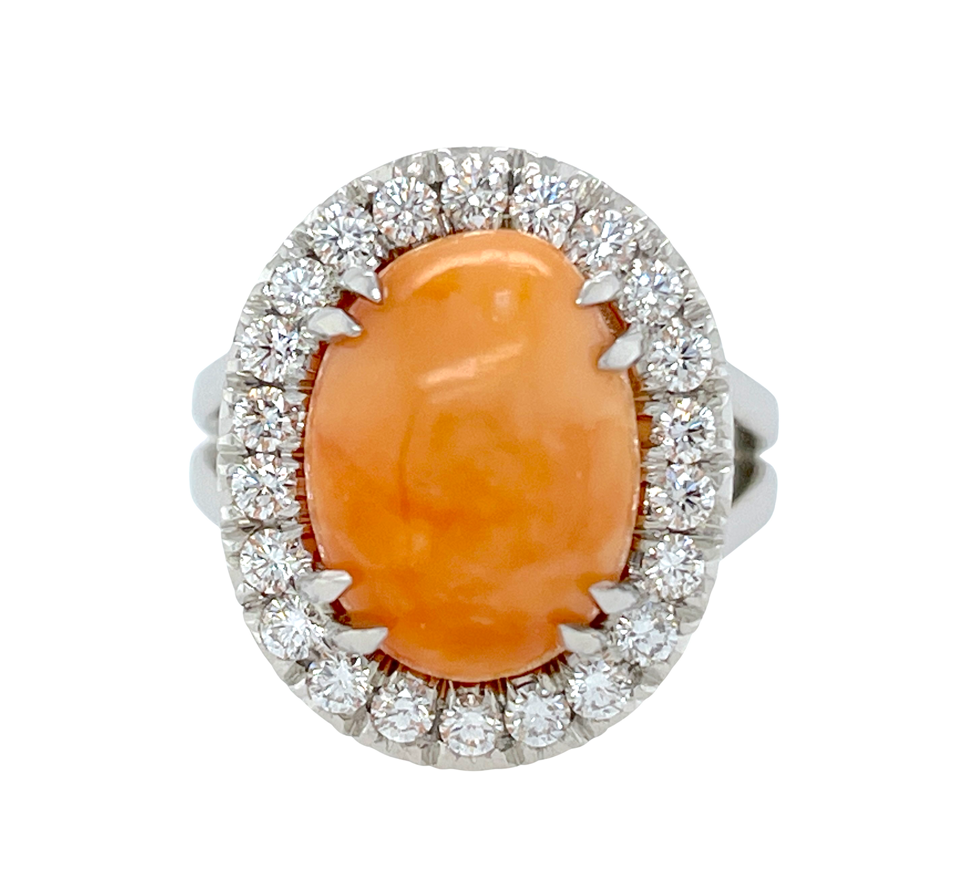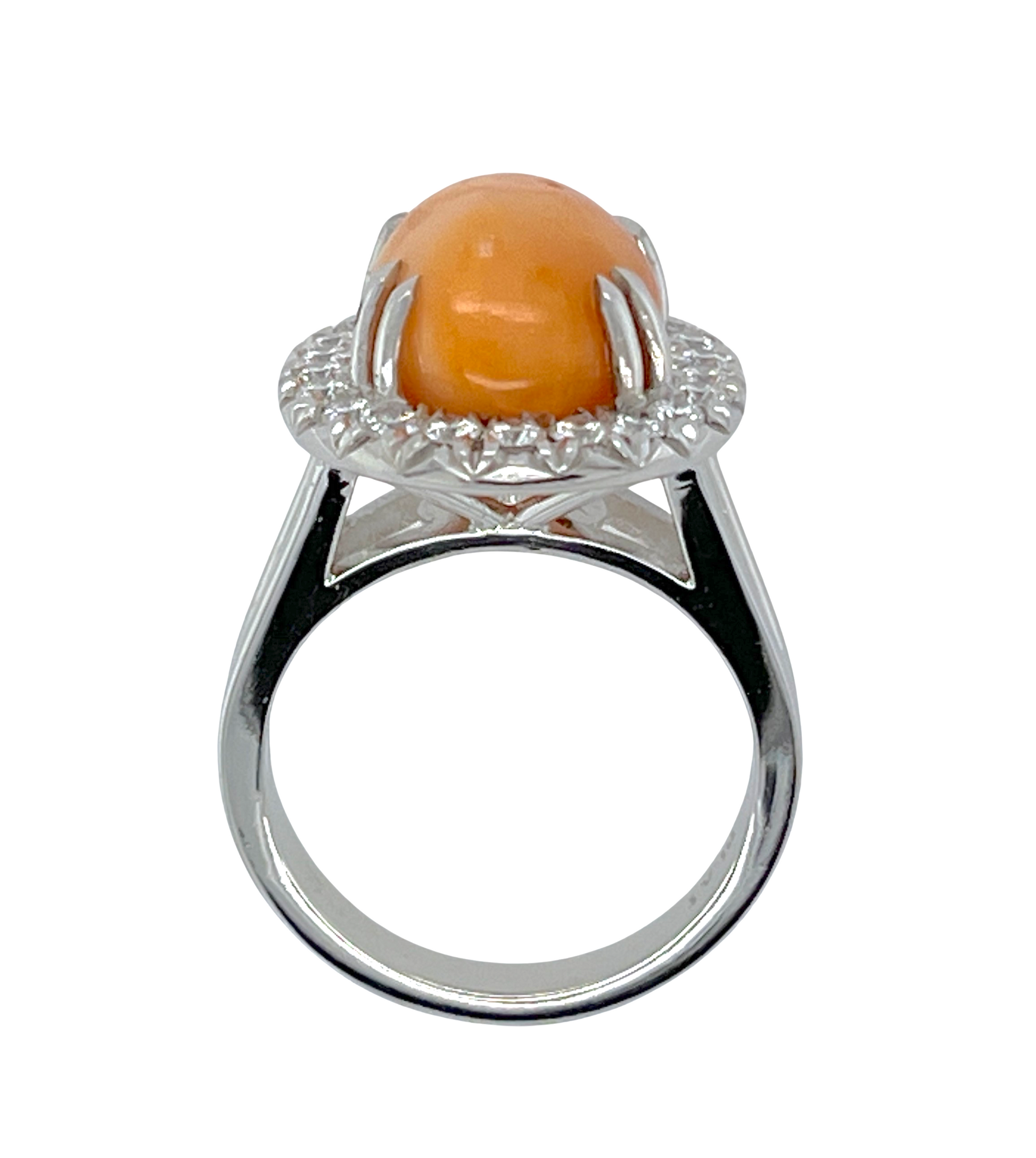 This magnificent, 1-of-a-kind platinum ring features an 11.45 ct. natural melo melo pearl framed by a halo of gem quality diamonds. Double talon prongs are used to secure the melo melo pearl while the diamonds are meticulously pavé set. Setting is stamped "PLAT".