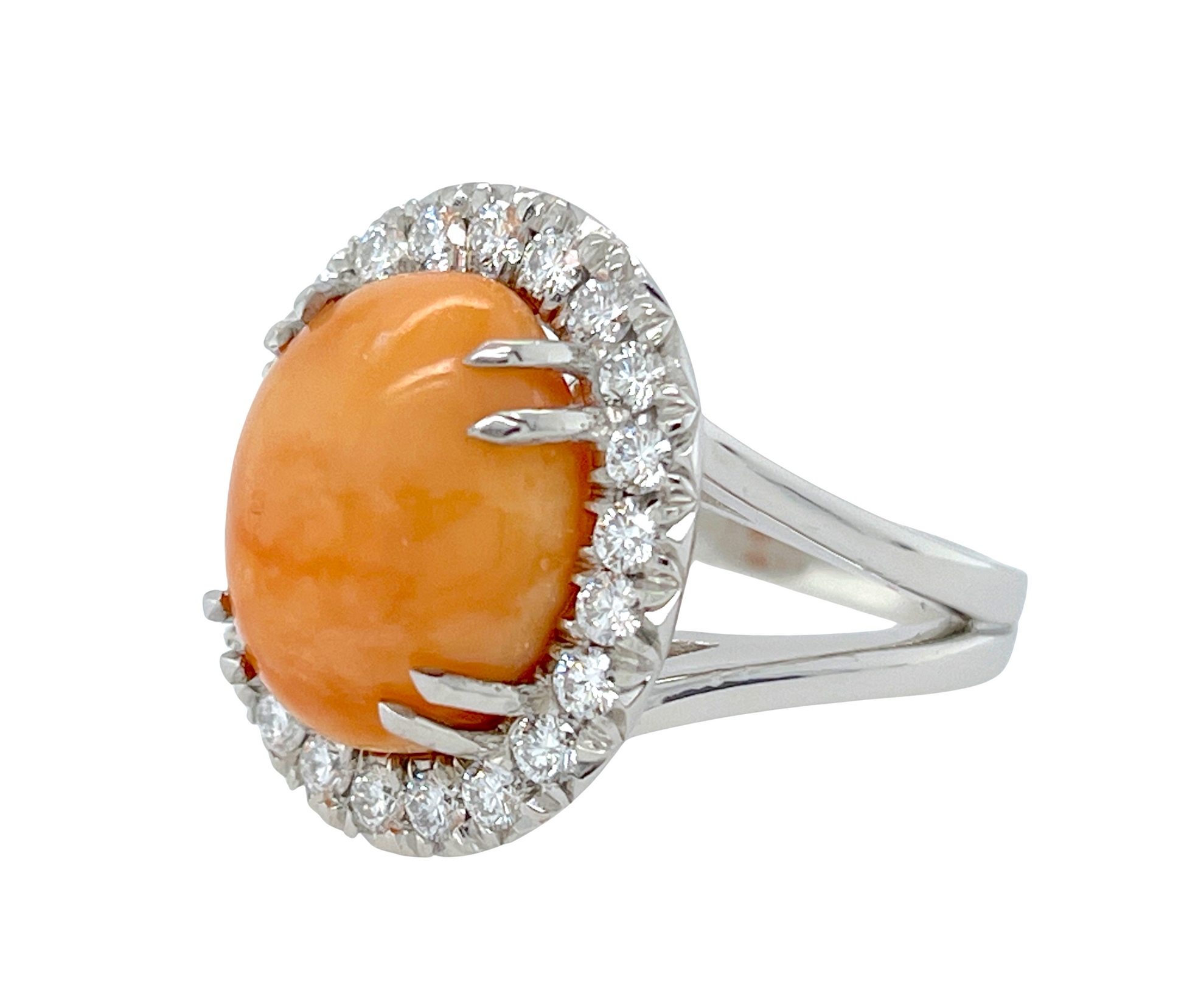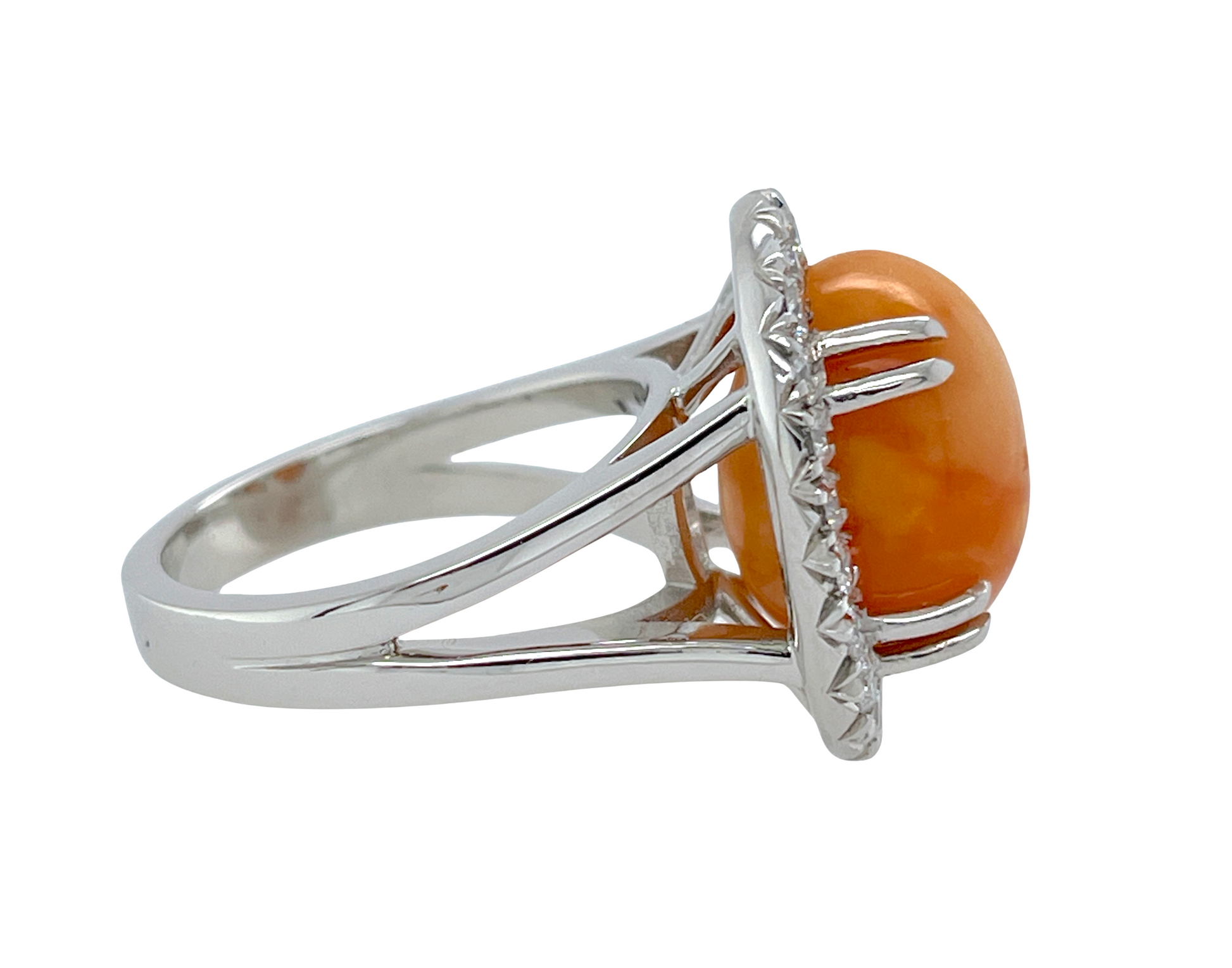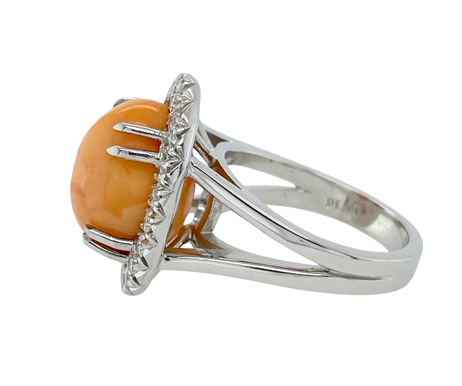 This magnificent, 1-of-a-kind platinum ring features an 11.45 ct. natural melo melo pearl framed by a halo of gem quality diamonds. Double talon prongs are used to secure the melo melo pearl while the diamonds are meticulously pavé set. Setting is stamped "PLAT".