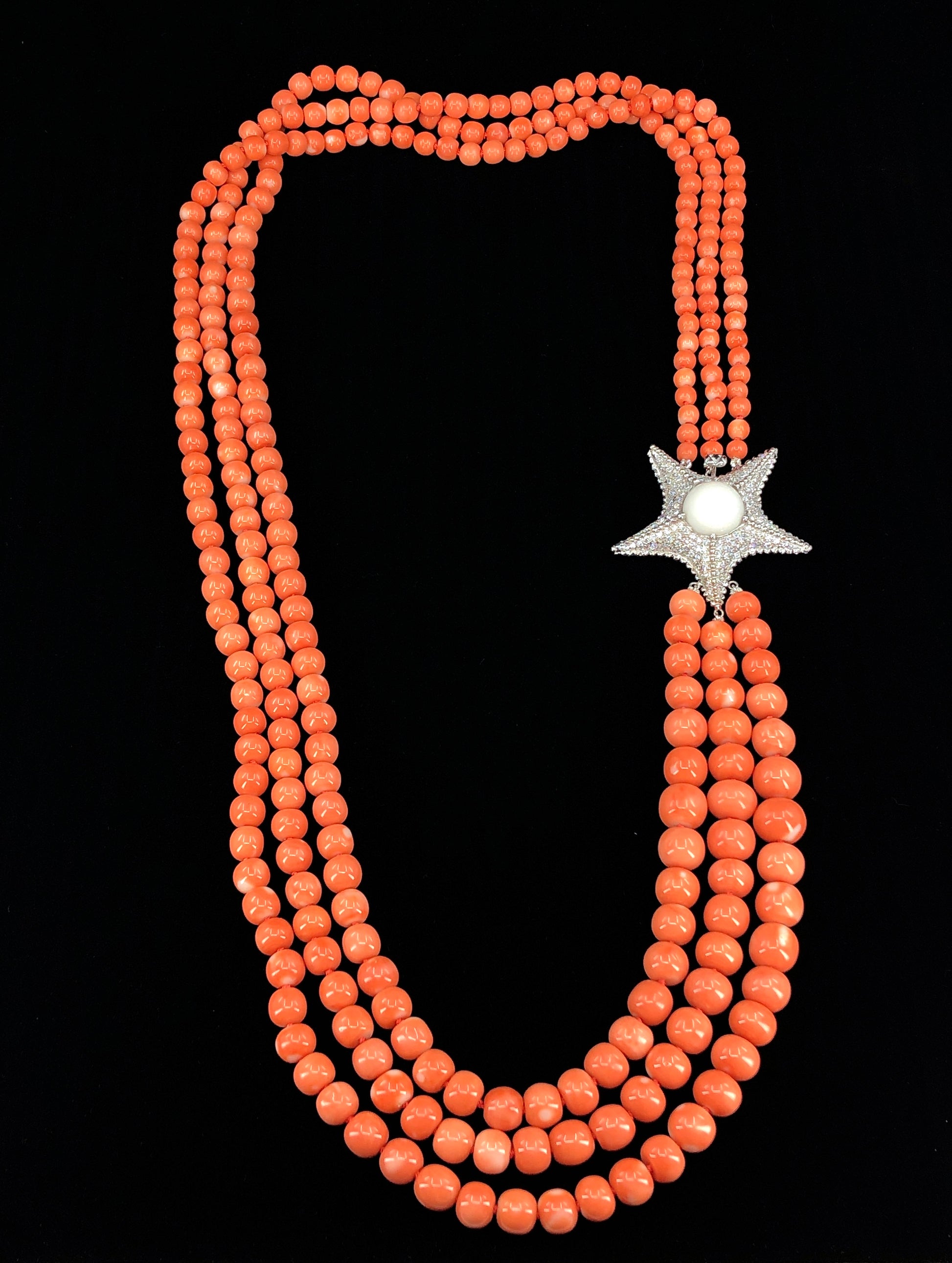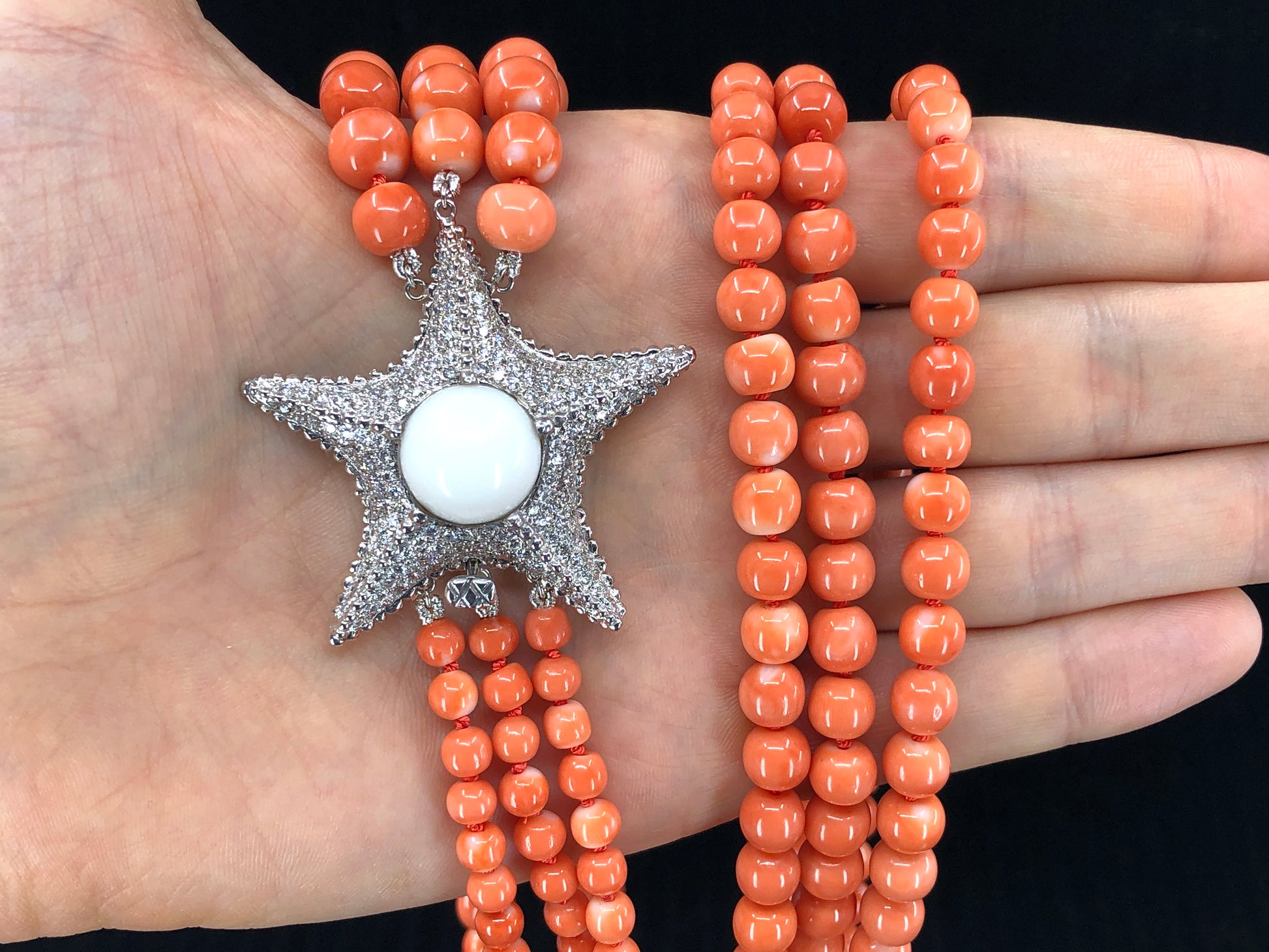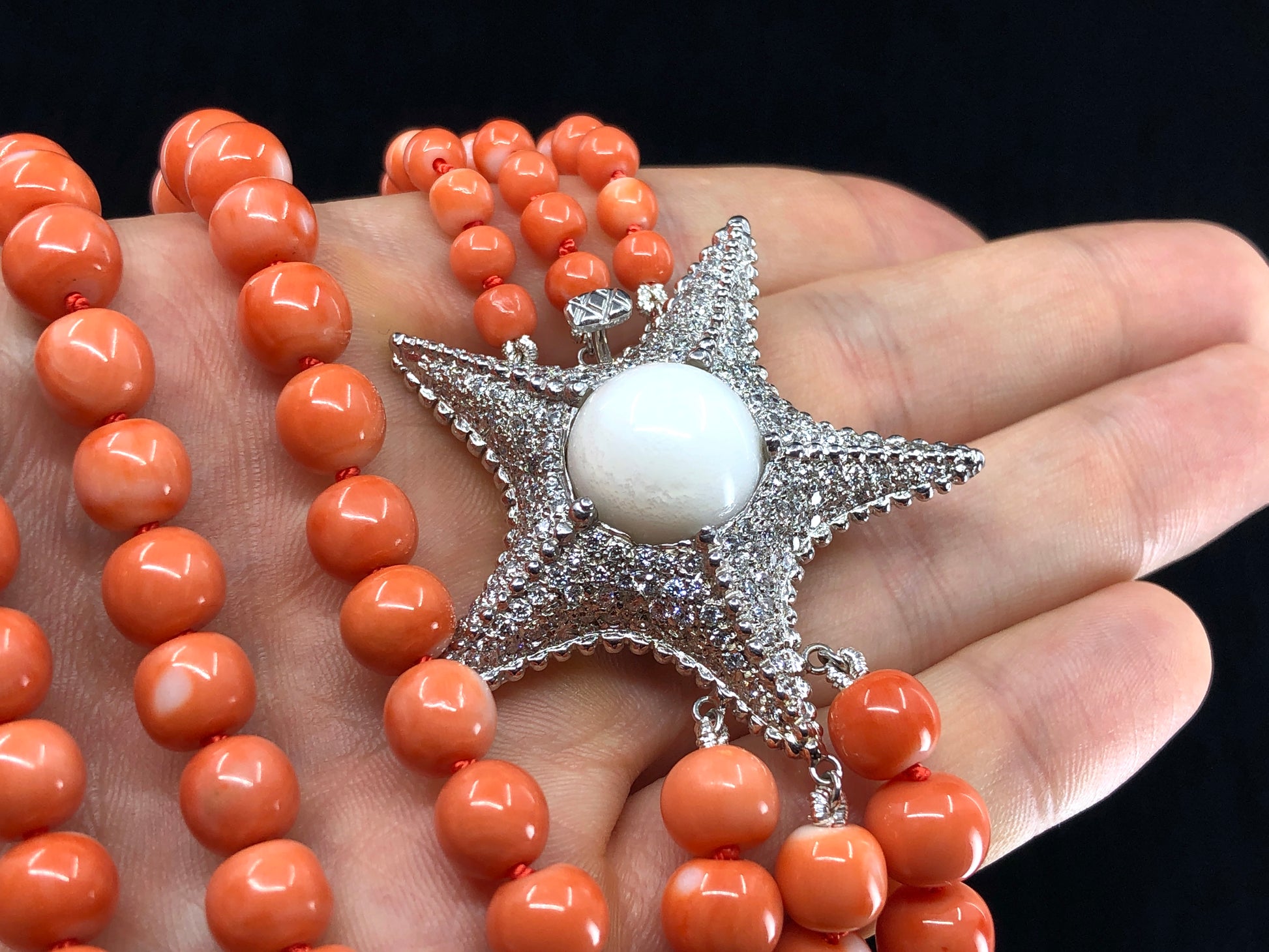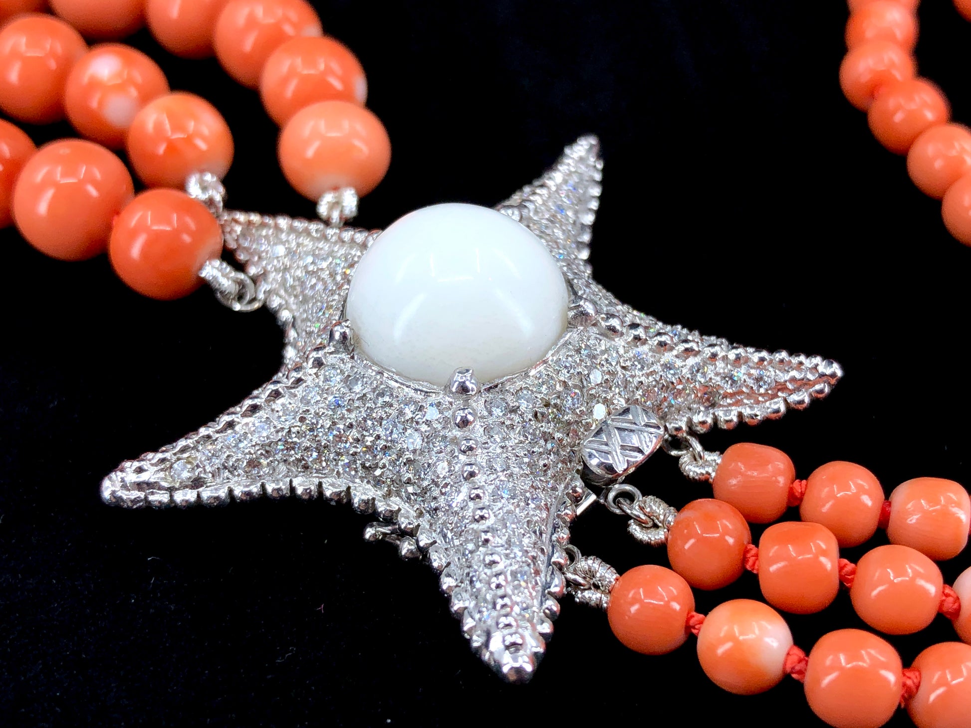 This magnificent, one-of-a-kind opera-length necklace features 293 graduated beads of natural precious coral, radiating warmth and elegance. The strands are secured with a custom-designed 18K white gold starfish clasp, pavé set with approximately 3.00 carats of fine quality round brilliant cut diamonds (G color, VS clarity). At the center of the starfish lies the crown jewel: a 17.71 carat natural Tridacna pearl, exhibiting striking eye-visible flame patterning—a true rarity.