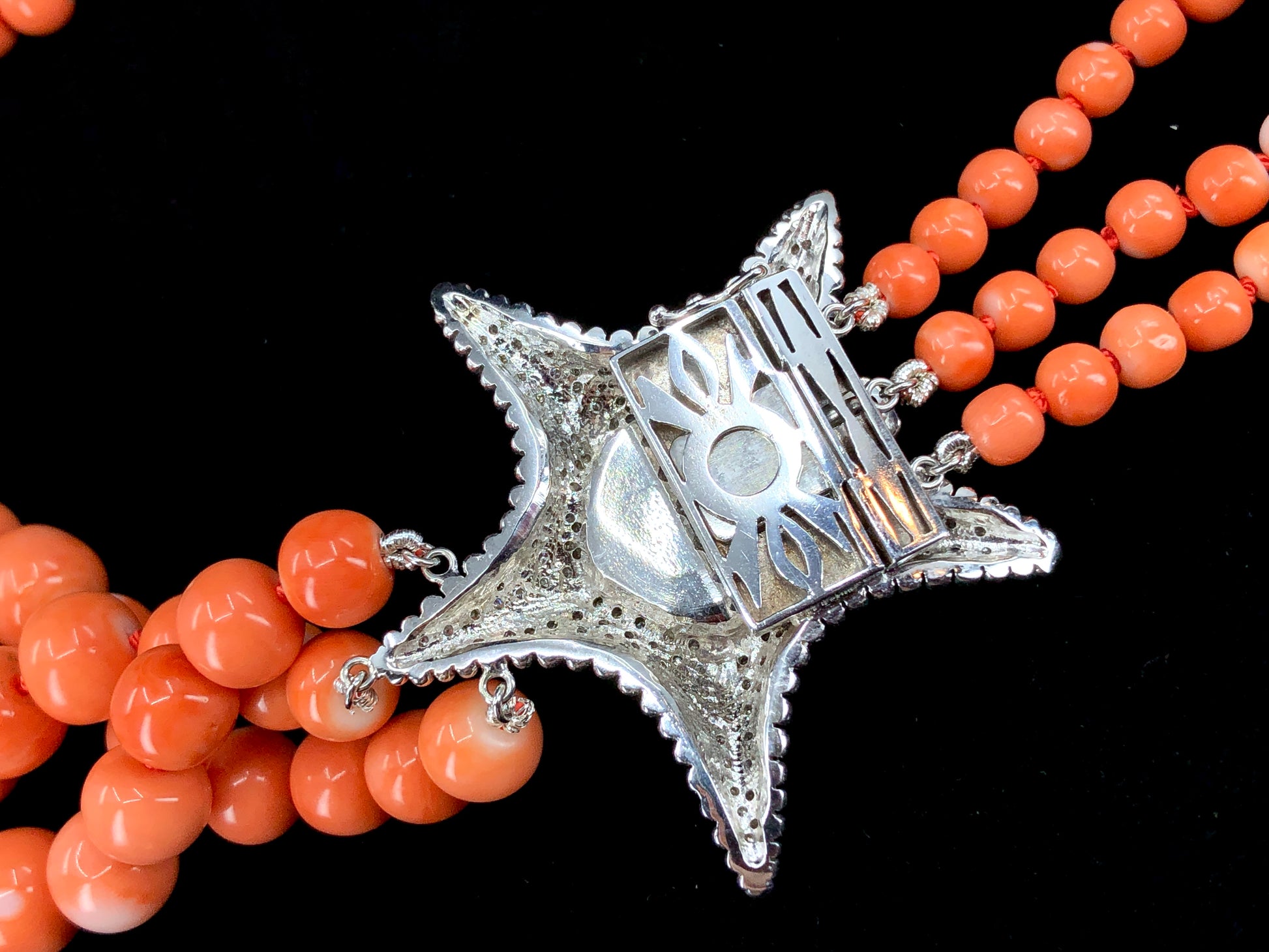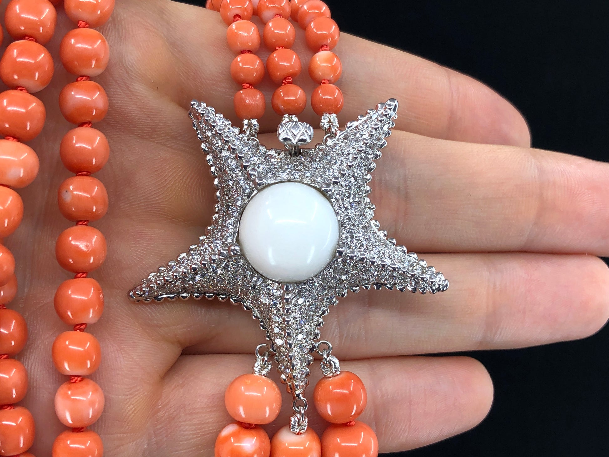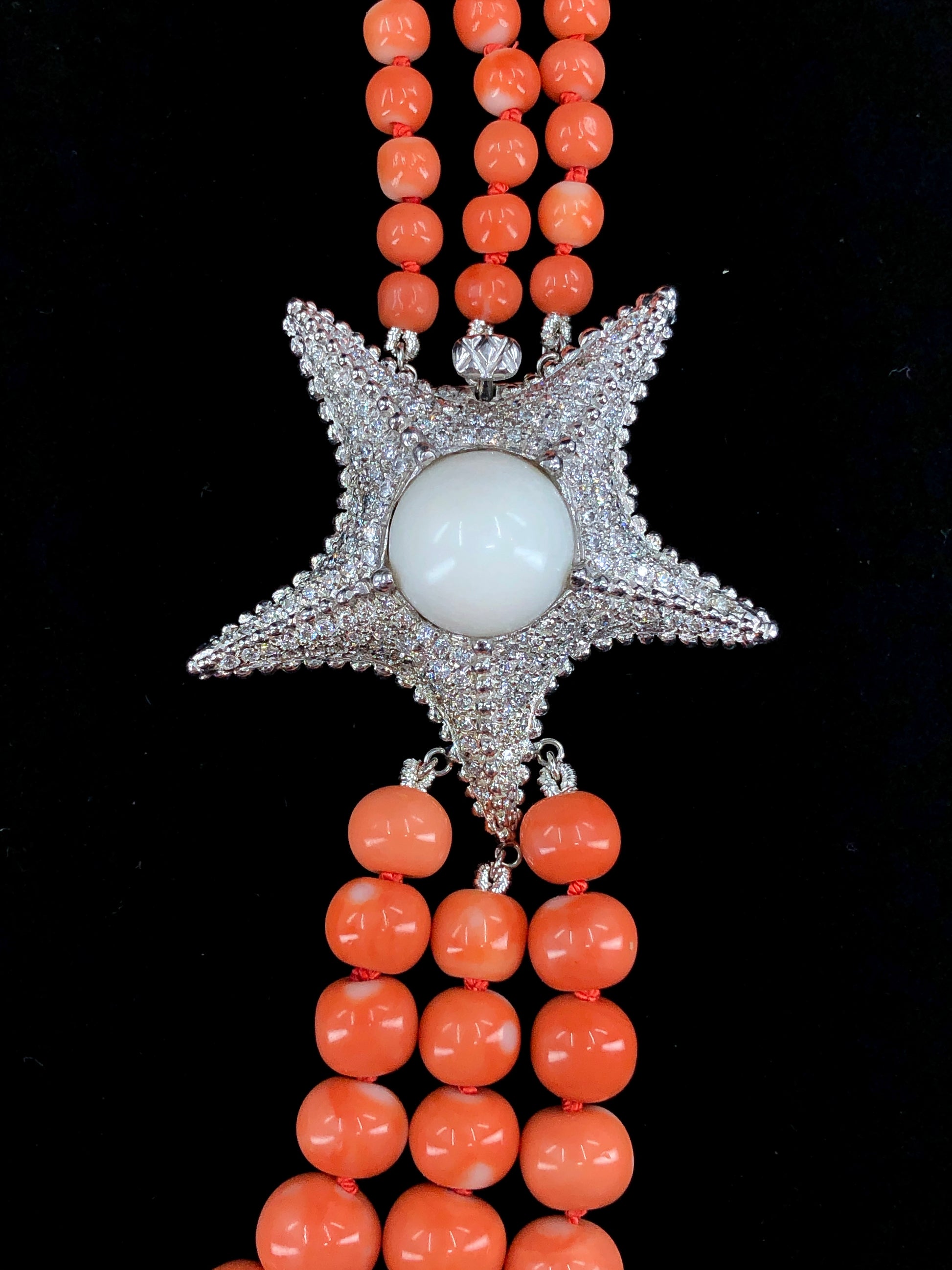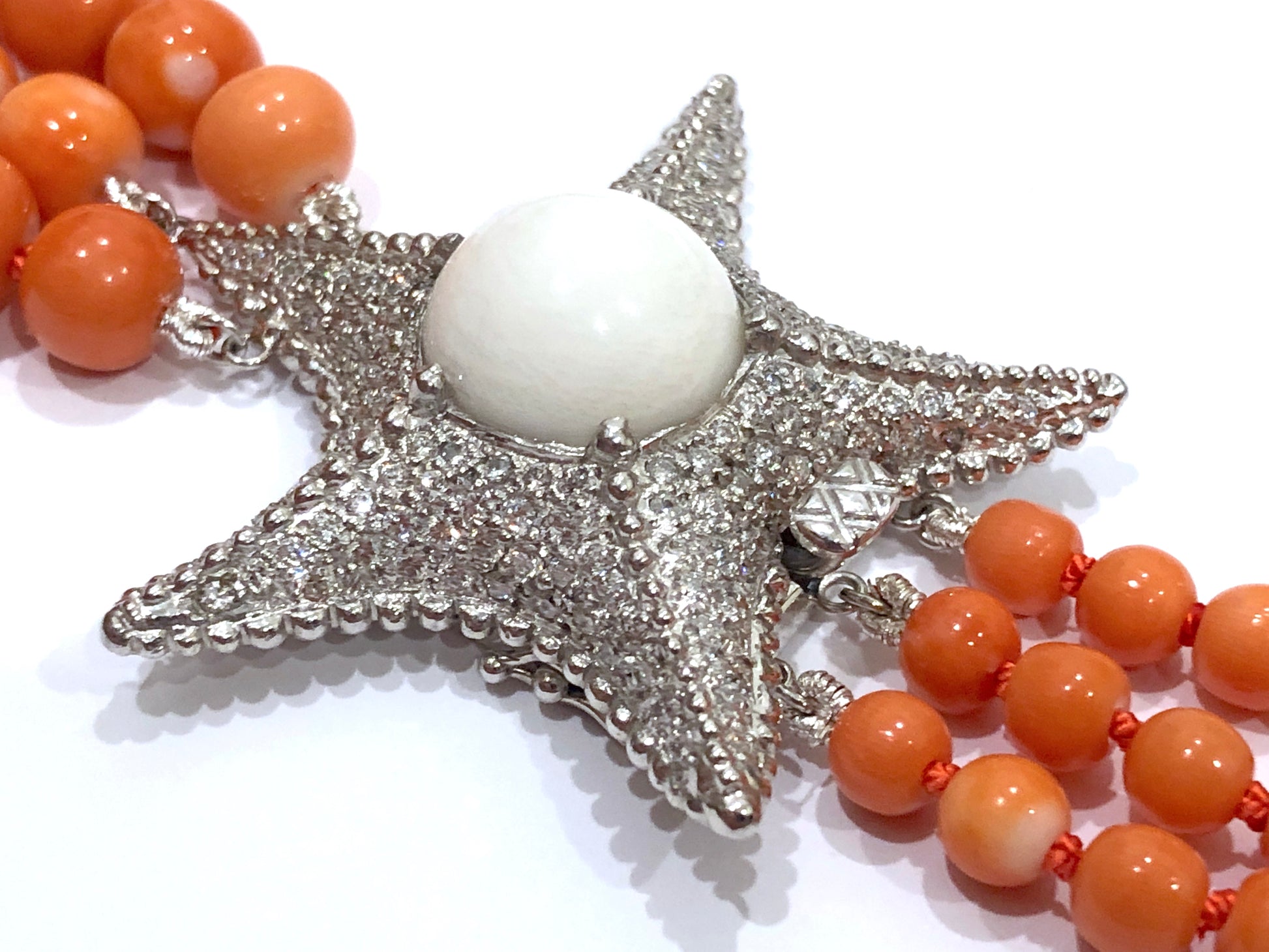This magnificent, one-of-a-kind opera-length necklace features 293 graduated beads of natural precious coral, radiating warmth and elegance. The strands are secured with a custom-designed 18K white gold starfish clasp, pavé set with approximately 3.00 carats of fine quality round brilliant cut diamonds (G color, VS clarity). At the center of the starfish lies the crown jewel: a 17.71 carat natural Tridacna pearl, exhibiting striking eye-visible flame patterning—a true rarity.