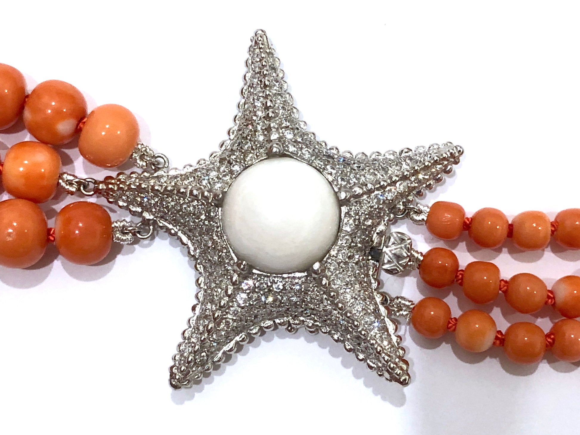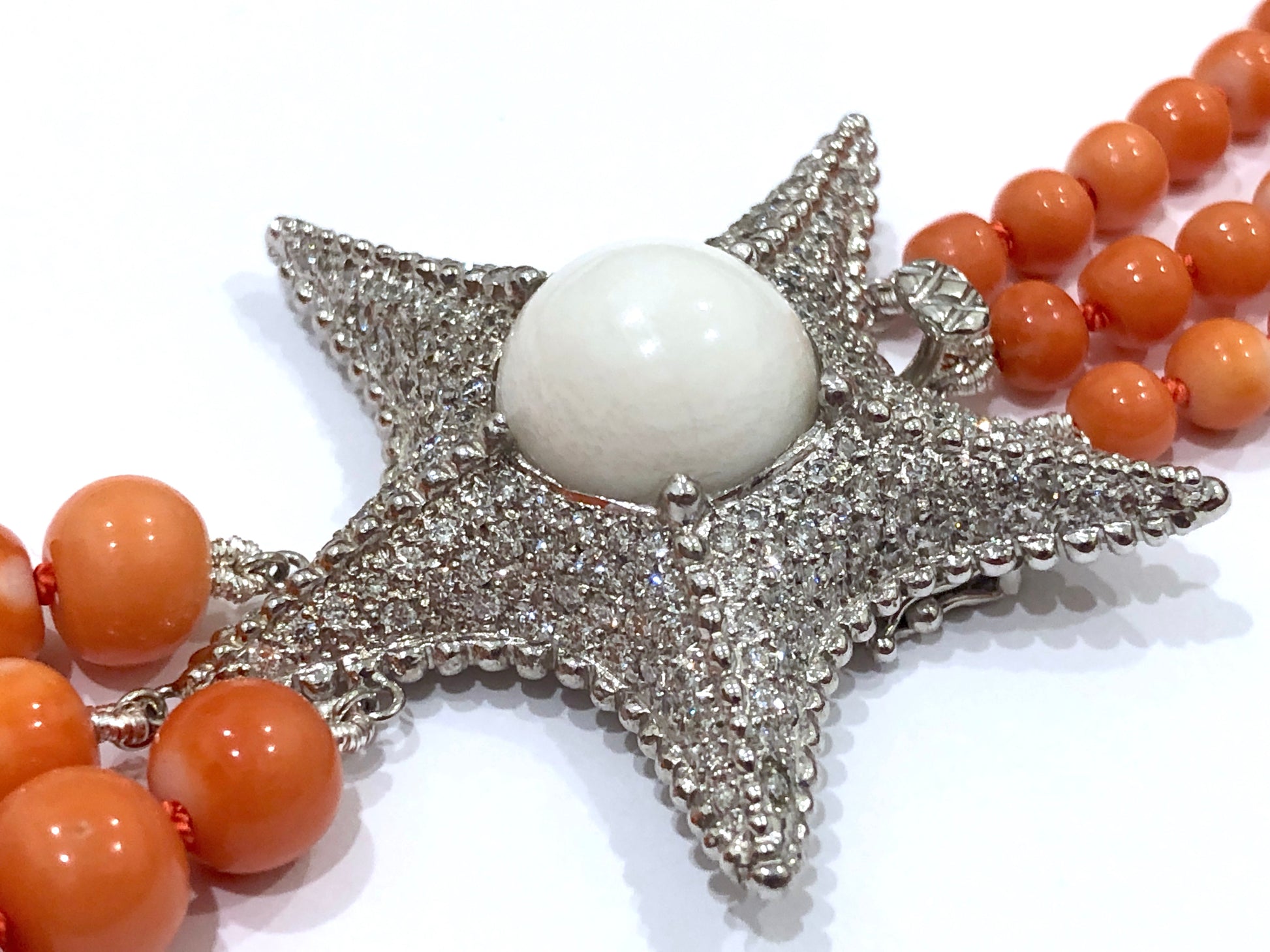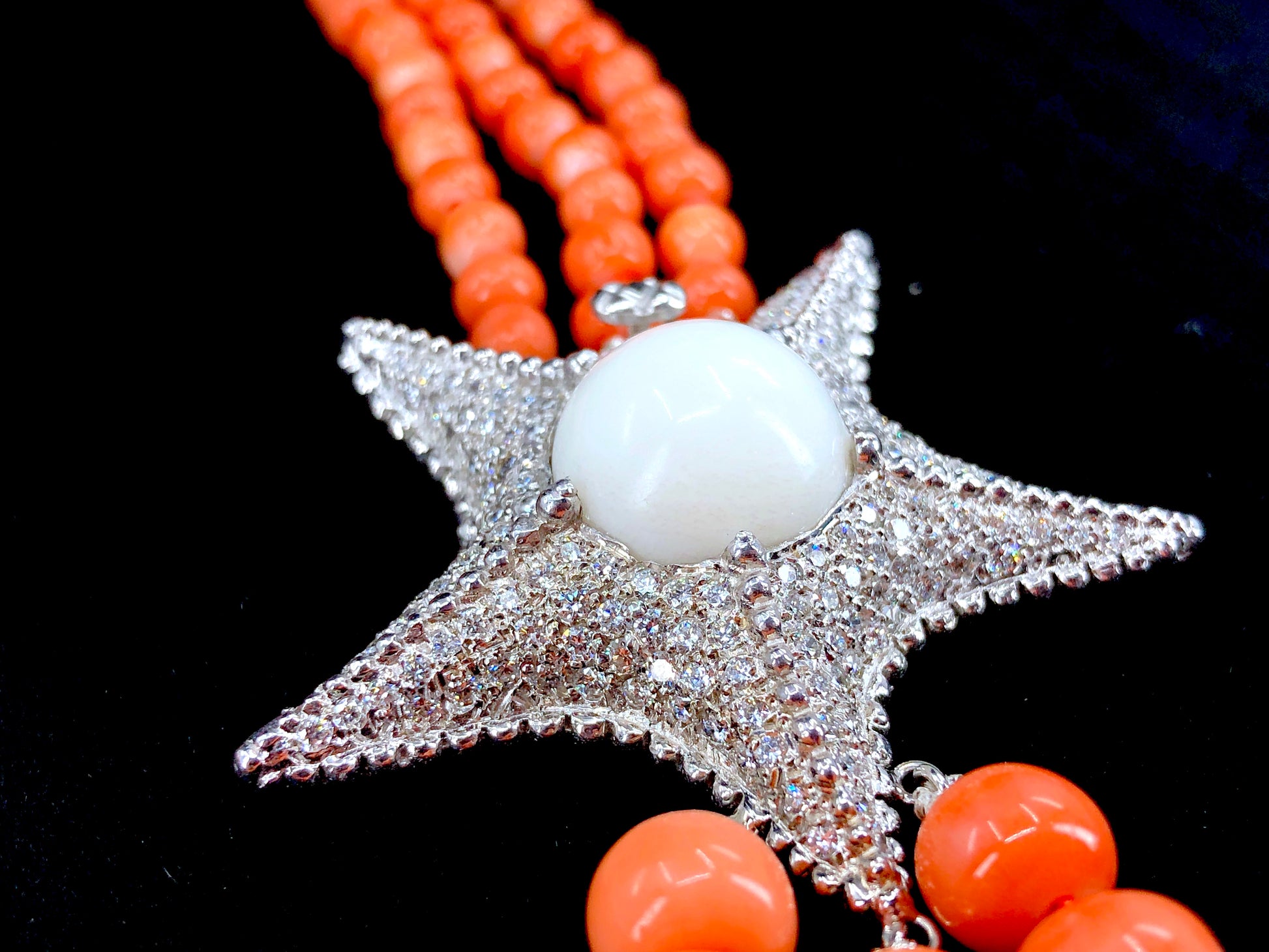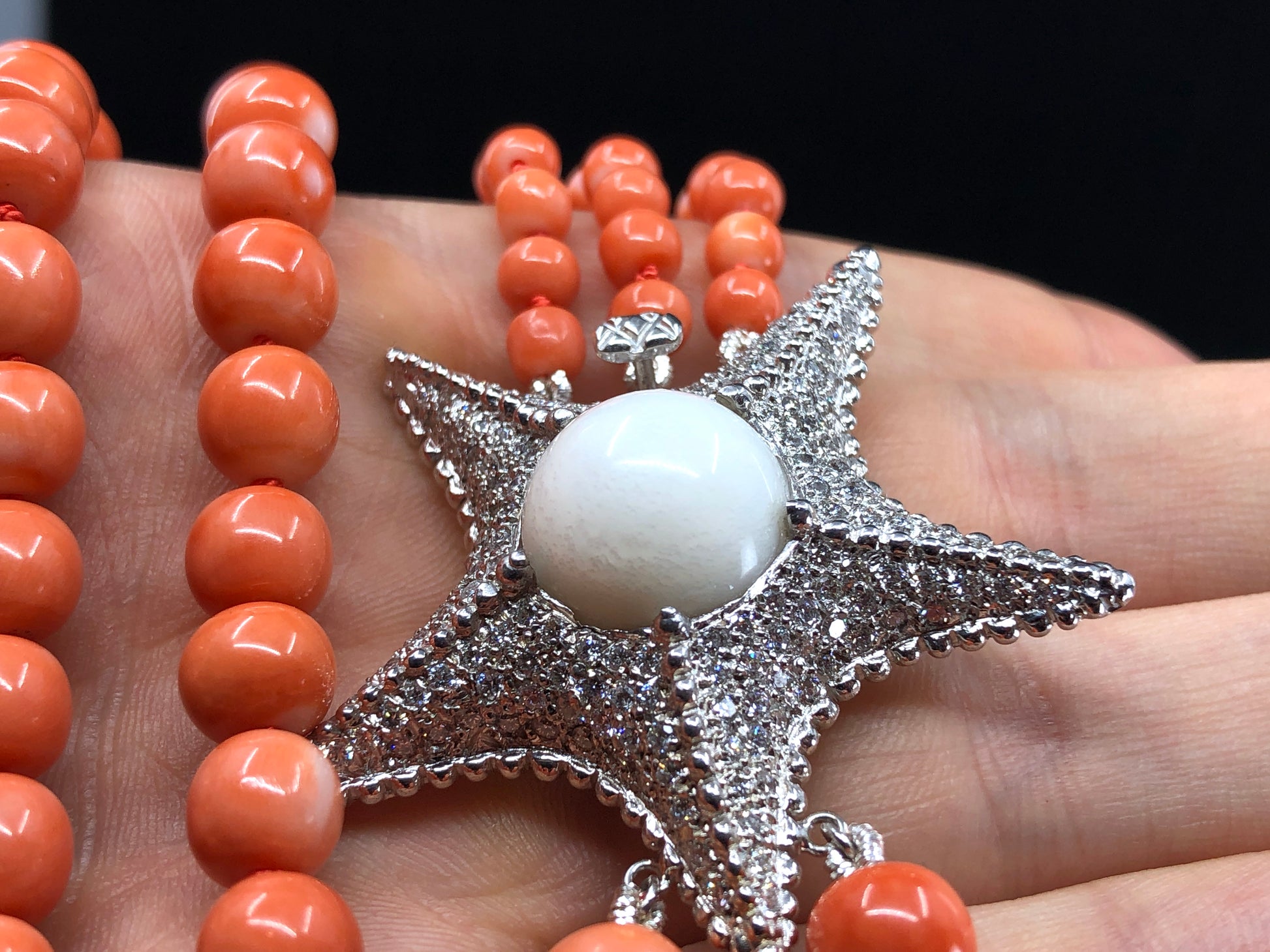 This magnificent, one-of-a-kind opera-length necklace features 293 graduated beads of natural precious coral, radiating warmth and elegance. The strands are secured with a custom-designed 18K white gold starfish clasp, pavé set with approximately 3.00 carats of fine quality round brilliant cut diamonds (G color, VS clarity). At the center of the starfish lies the crown jewel: a 17.71 carat natural Tridacna pearl, exhibiting striking eye-visible flame patterning—a true rarity.