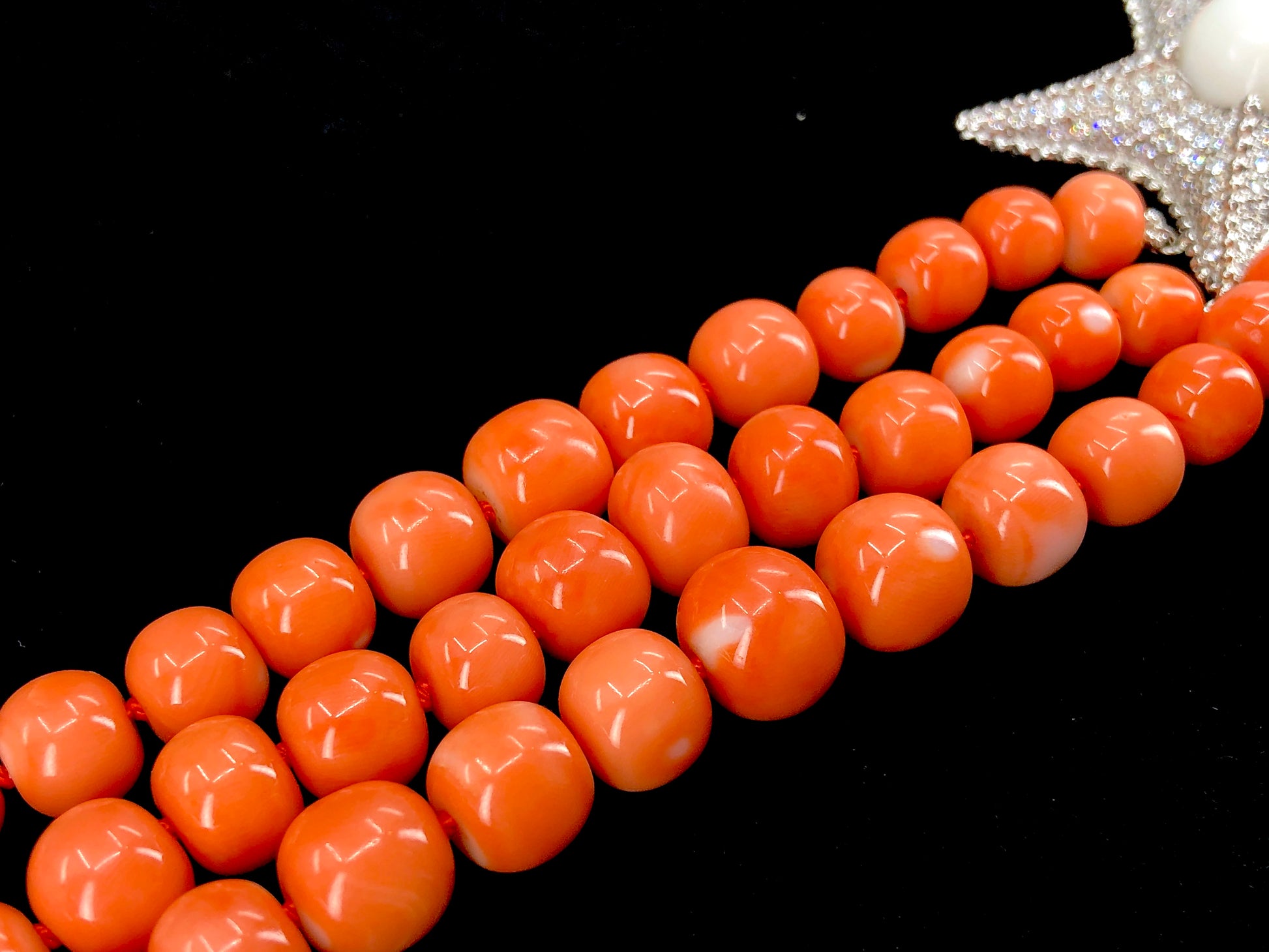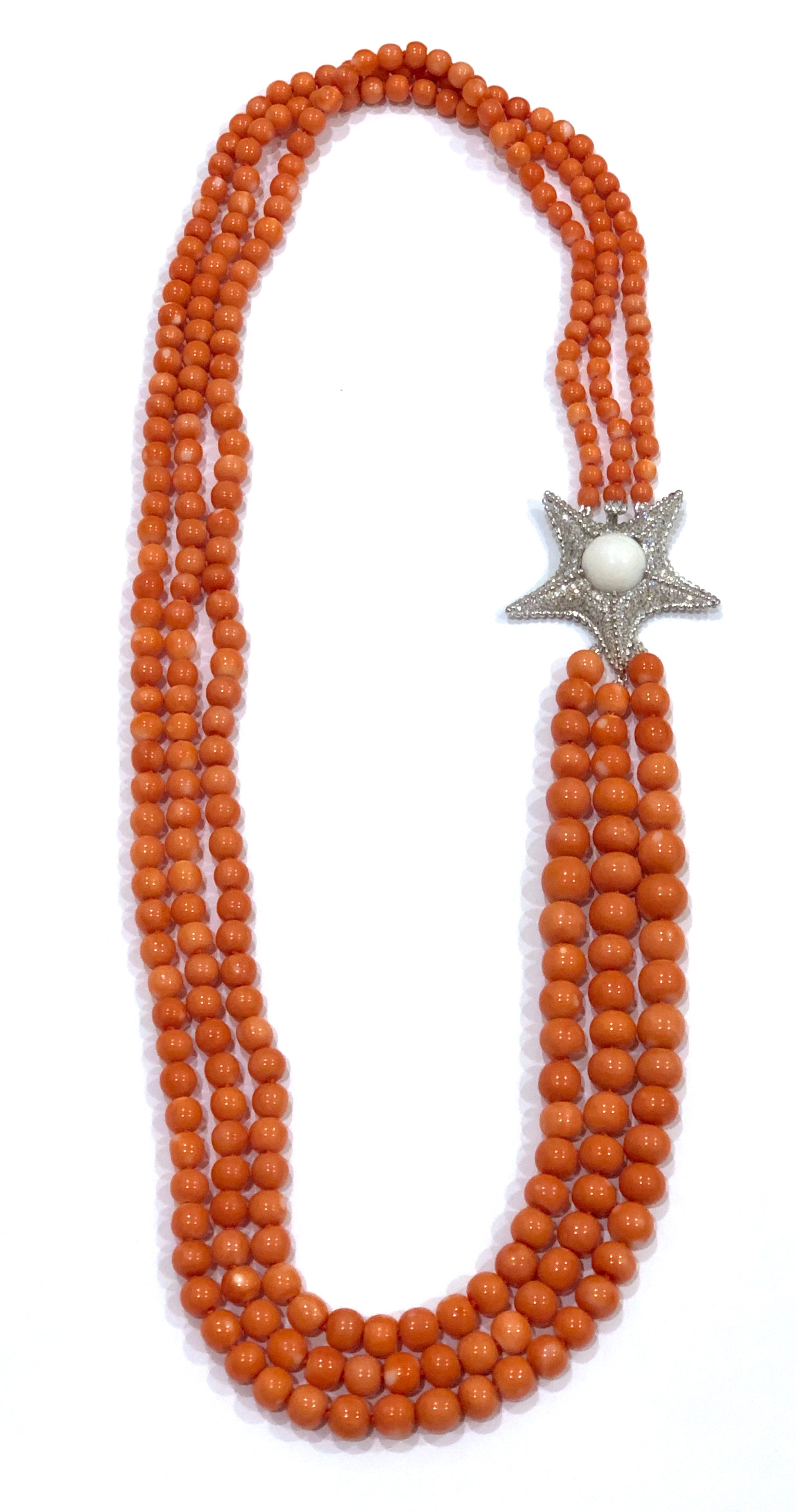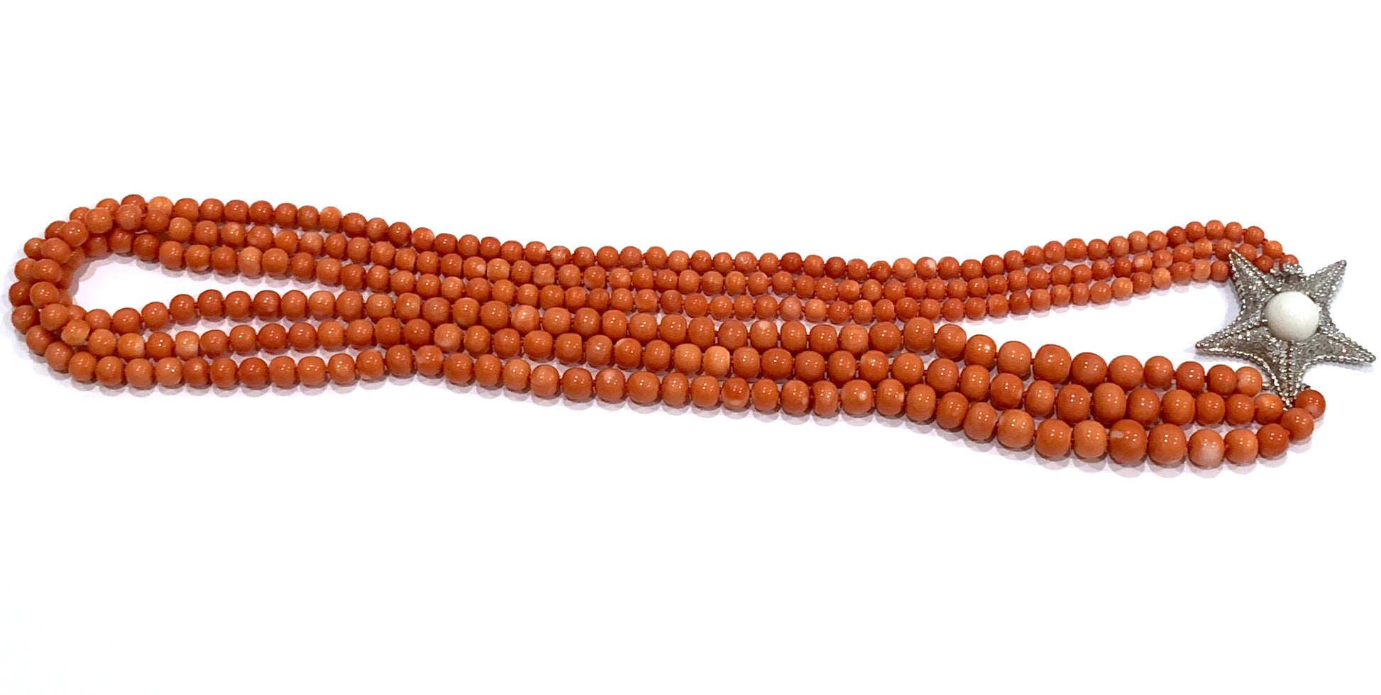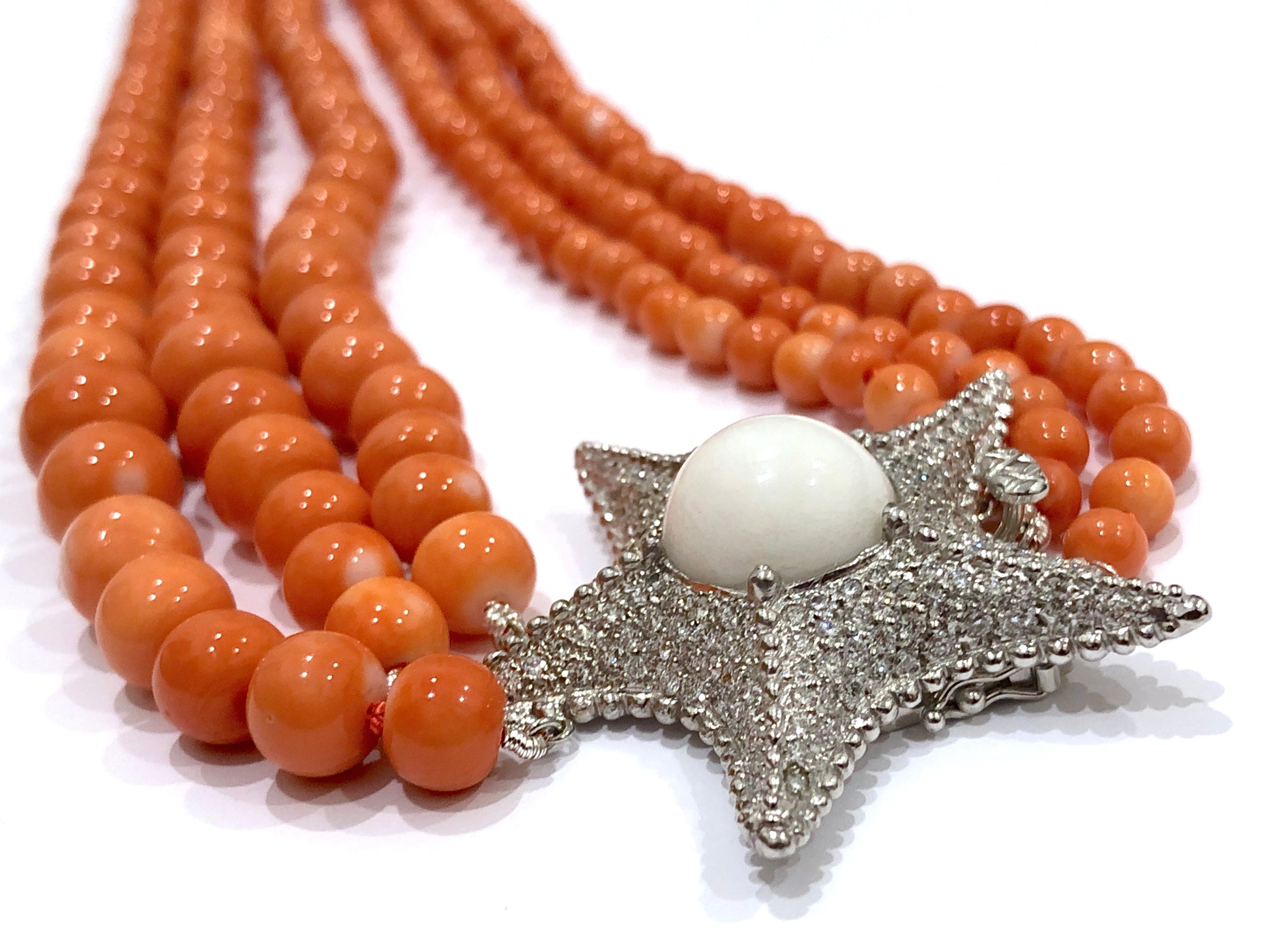 This magnificent, one-of-a-kind opera-length necklace features 293 graduated beads of natural precious coral, radiating warmth and elegance. The strands are secured with a custom-designed 18K white gold starfish clasp, pavé set with approximately 3.00 carats of fine quality round brilliant cut diamonds (G color, VS clarity). At the center of the starfish lies the crown jewel: a 17.71 carat natural Tridacna pearl, exhibiting striking eye-visible flame patterning—a true rarity.
